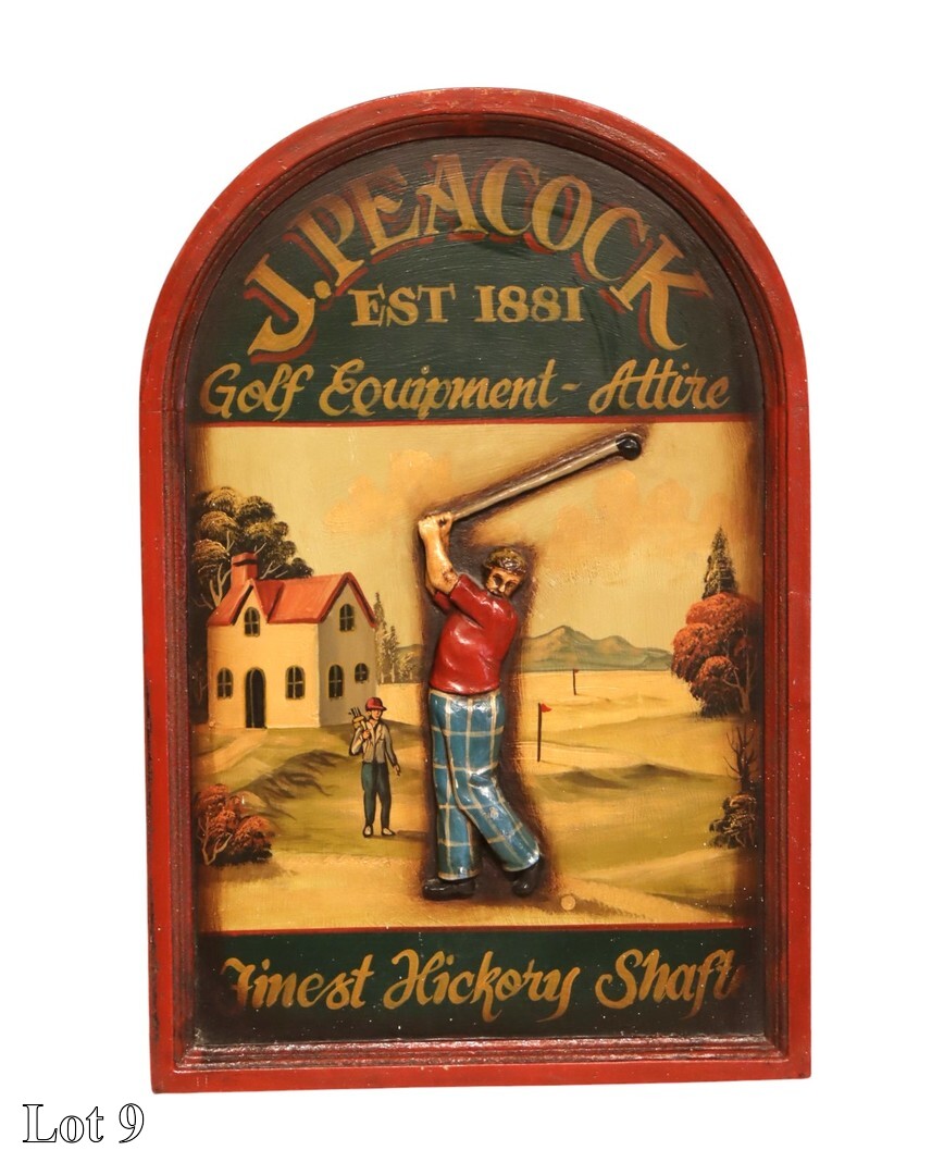 J.Peacock Golf equipment - Attire, wooden painted sign. ( Width:40 Height:60 )