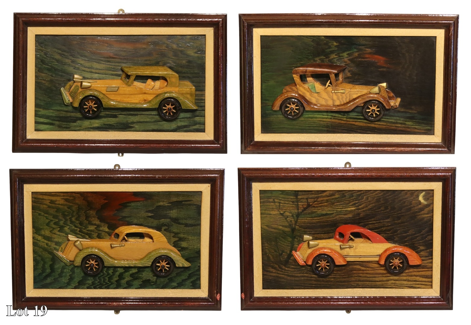 A set of four carved wood classic cars, framed. ( Width:60 Height:39 )