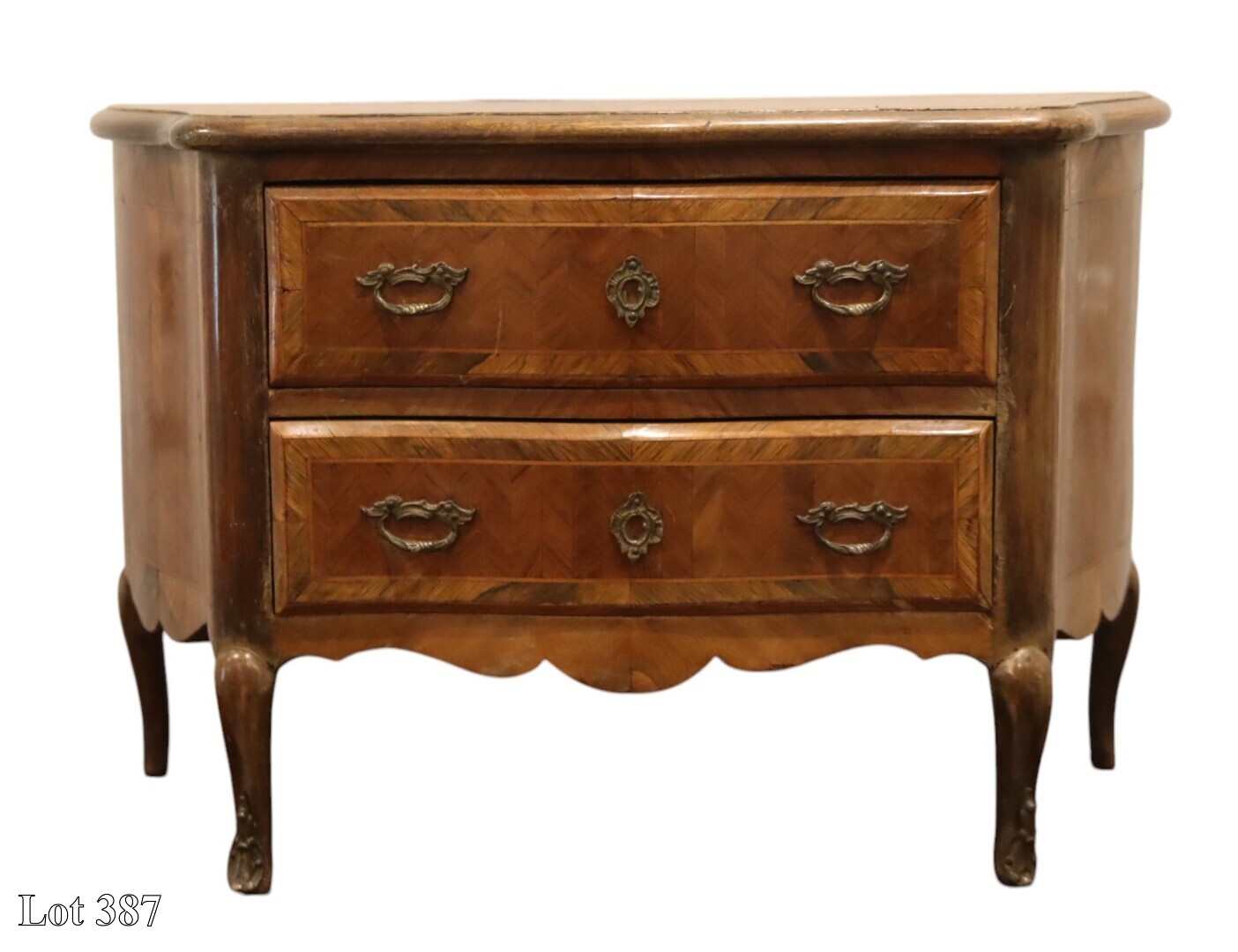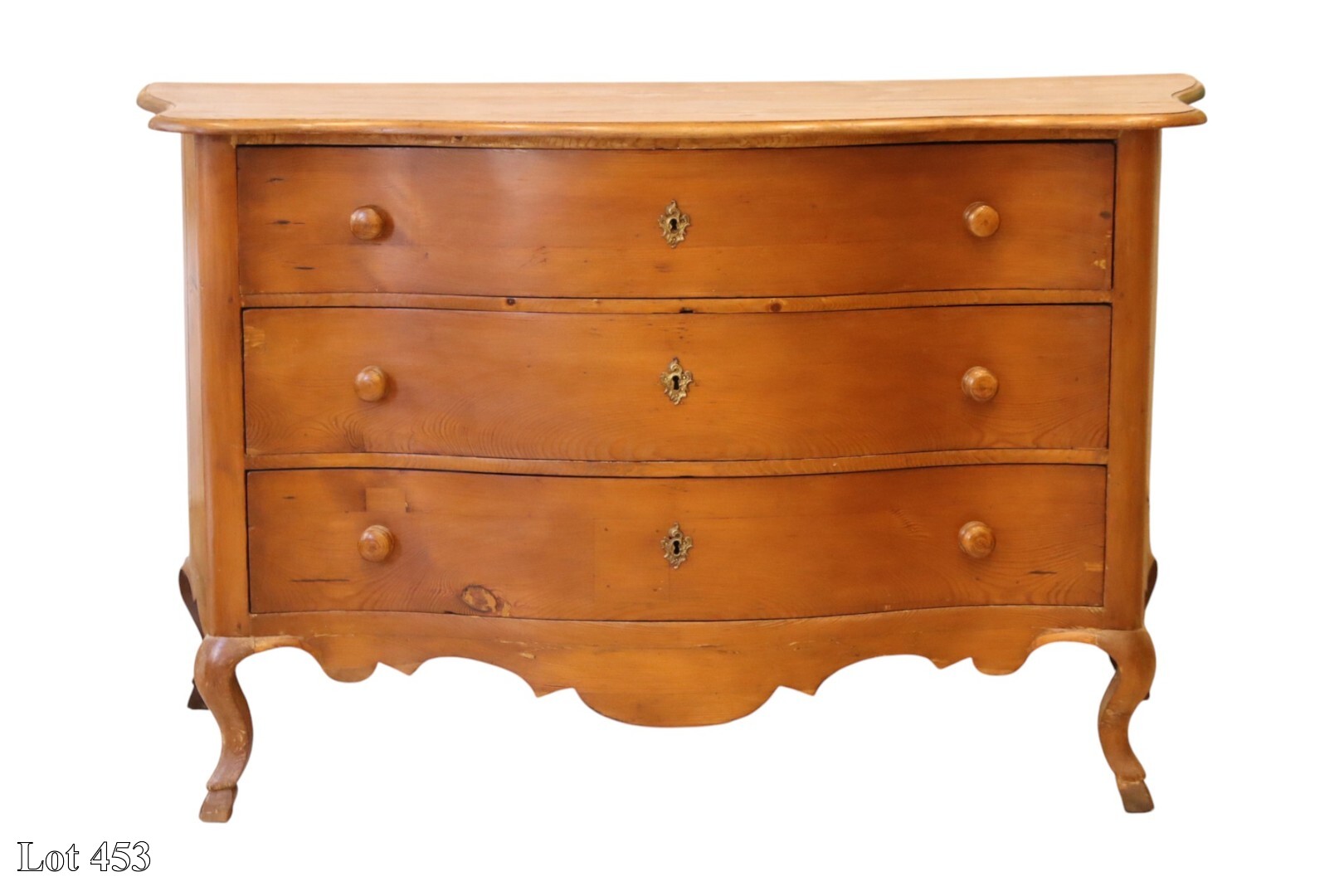 Late 18th/early 19th Century Maltese bow fronted chest of three drawers, with concave sides on cabriole legs.