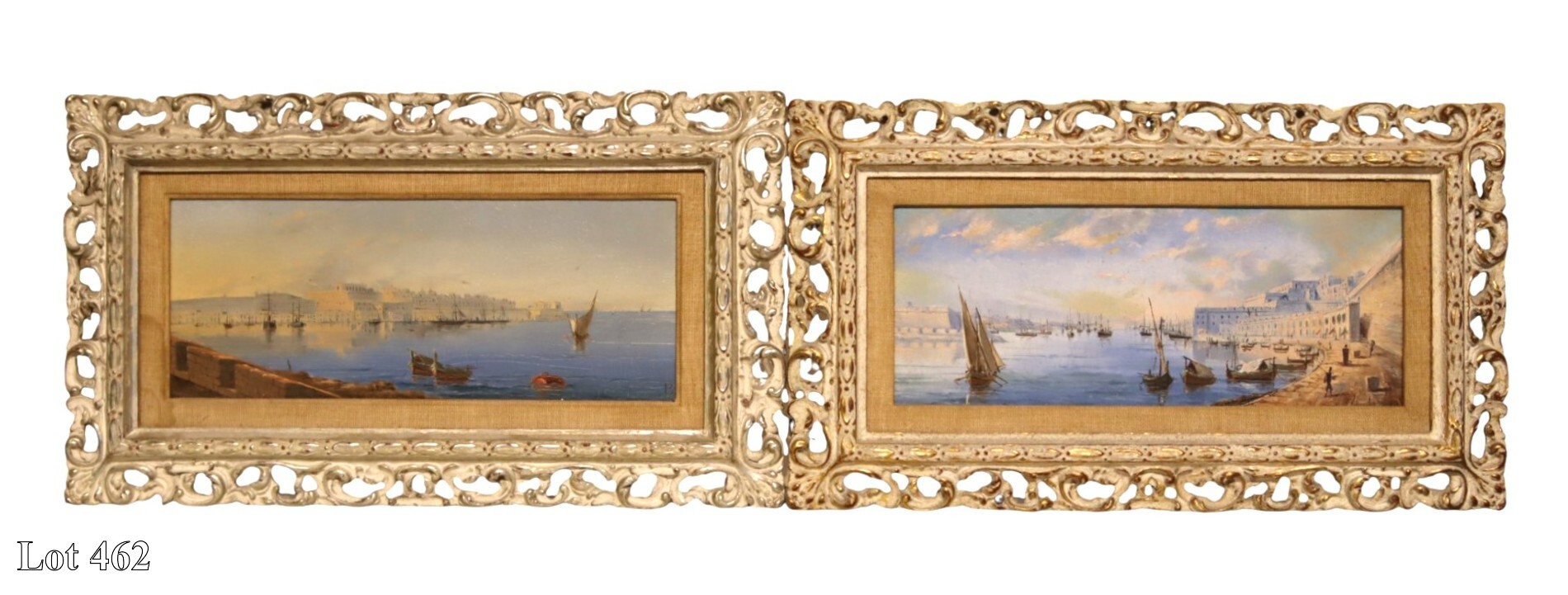 J.Bonello, a pair of Grand Harbour Scenes, oil on board, signed, in ornate frame. ( Width:51 Height:30 )