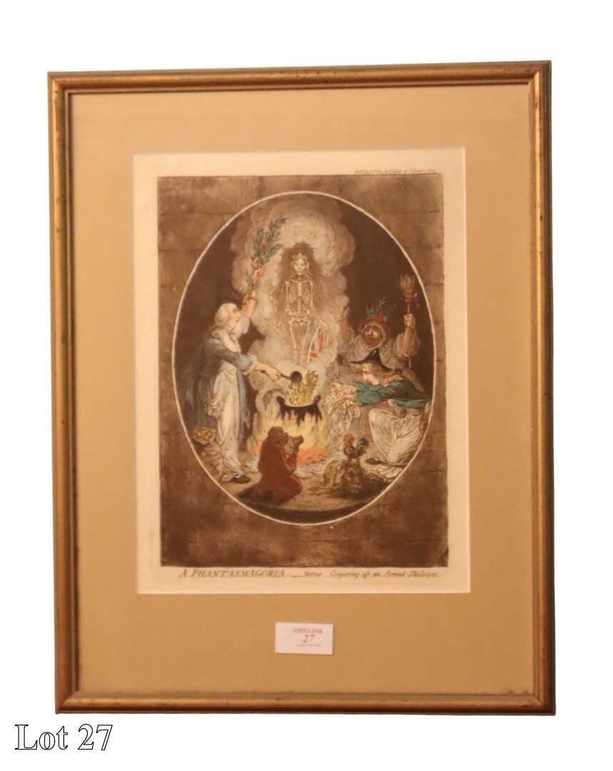 19th Century caricature, A Phantasmagoria Scene conjuring up an Armed Skeleton, coloured engraving, dated 1803, (published in Malta and British and French Caricature, 1798 - 1815). ( Width:32 Height:54 )