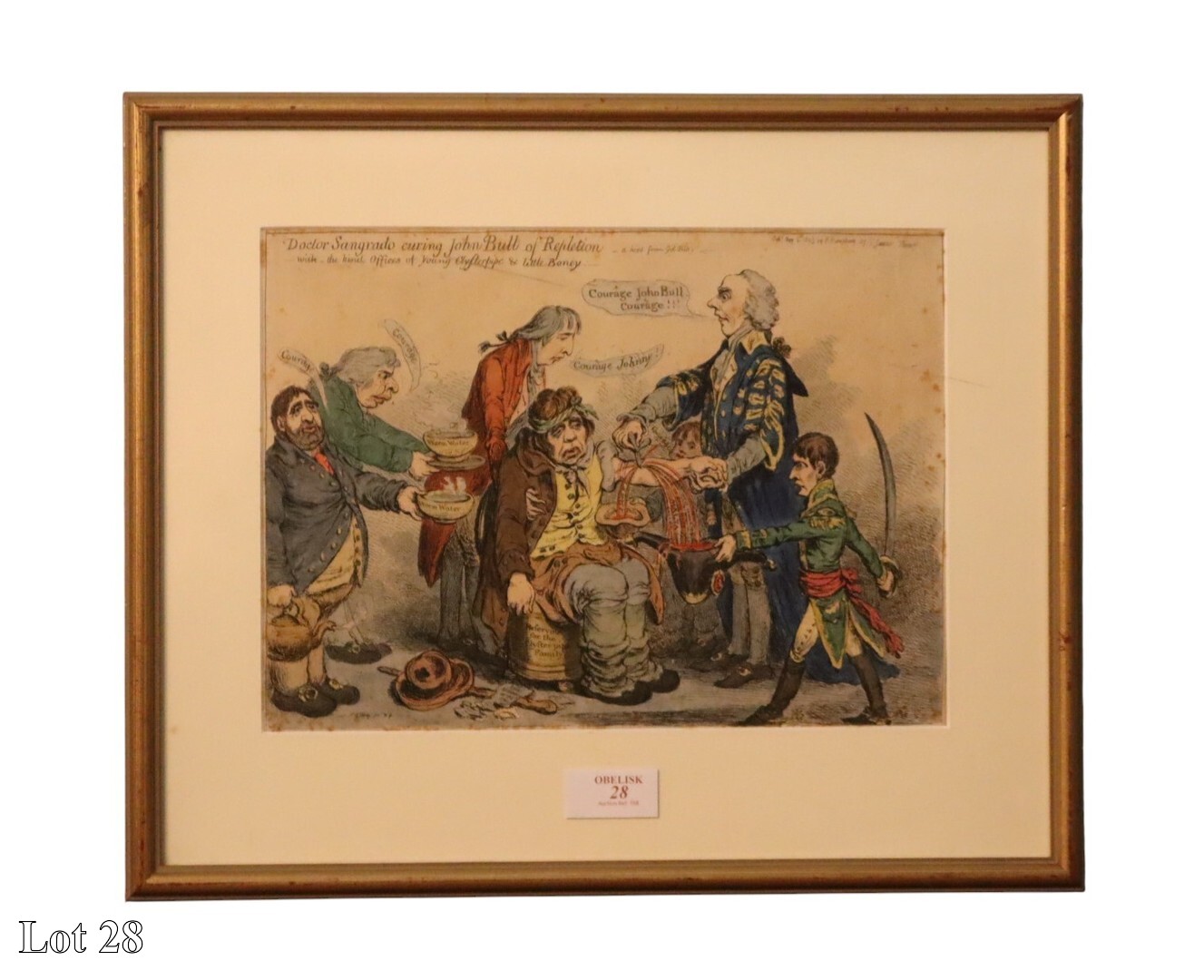 19th Century caricature, Doctor Sangrado quiring John Bull of Repletion, coloured engraving, dated 1803, (published in Malta and British and French Caricature, 1798 - 1815). ( Width:50 Height:41 )
