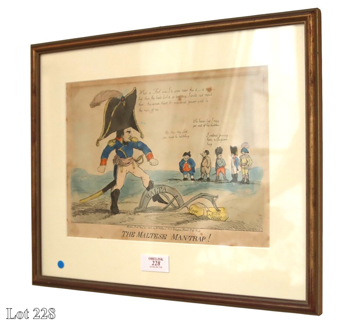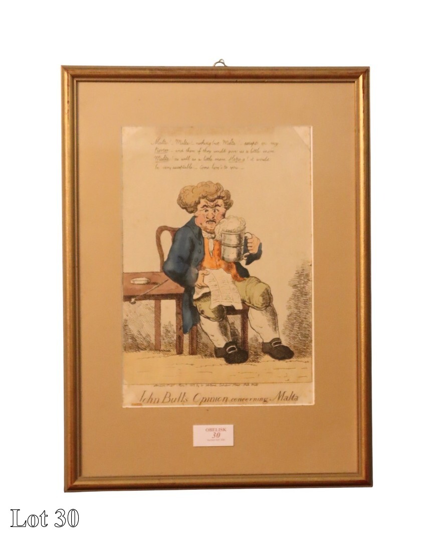 19th Century caricature, John Bulls opinion concerning Malta, coloured engraving, dated 1803, (published in Malta and British and French Caricature, 1798 - 1815). ( Width:37 Height:50 )