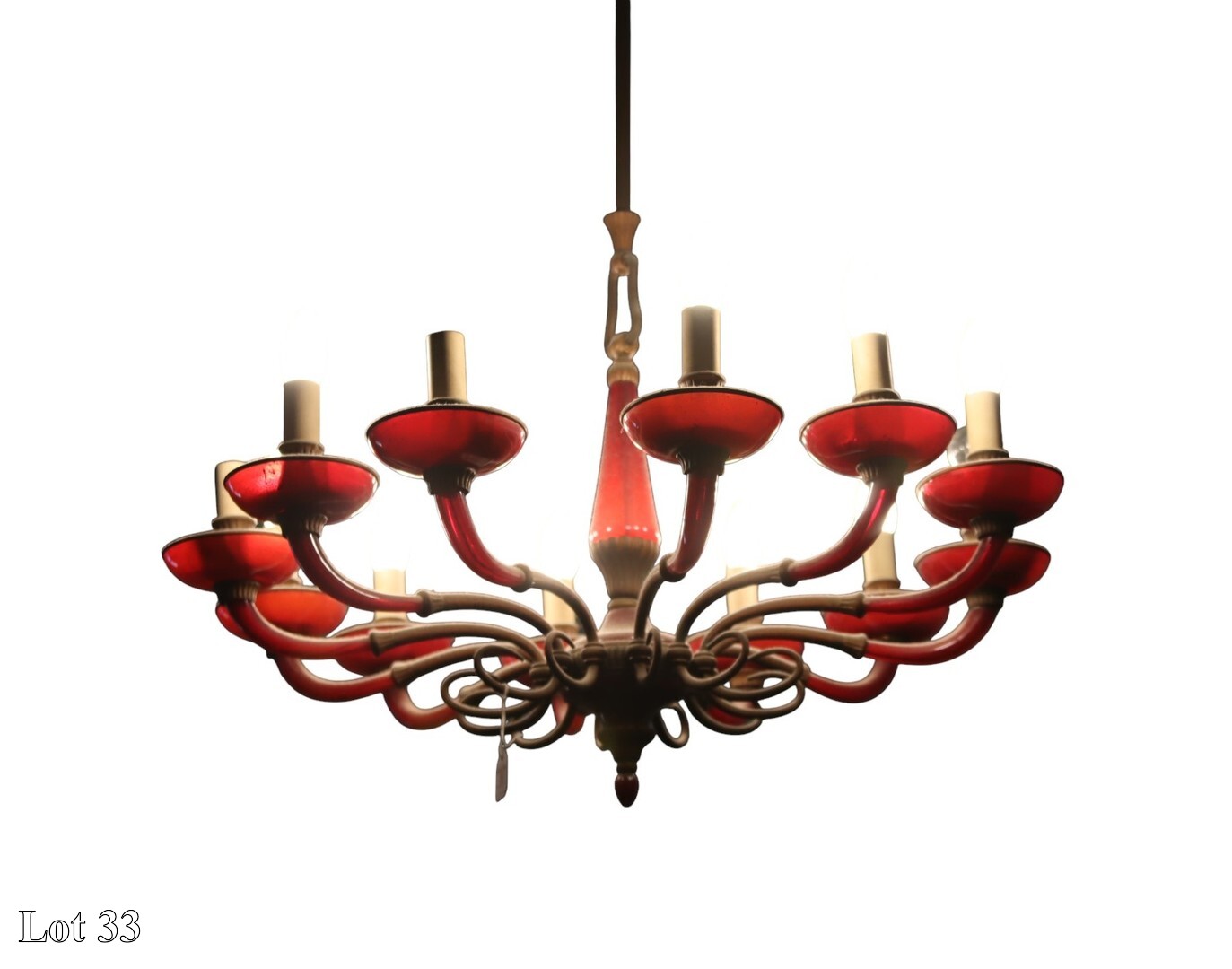 A twelve branch red glass chandelier.