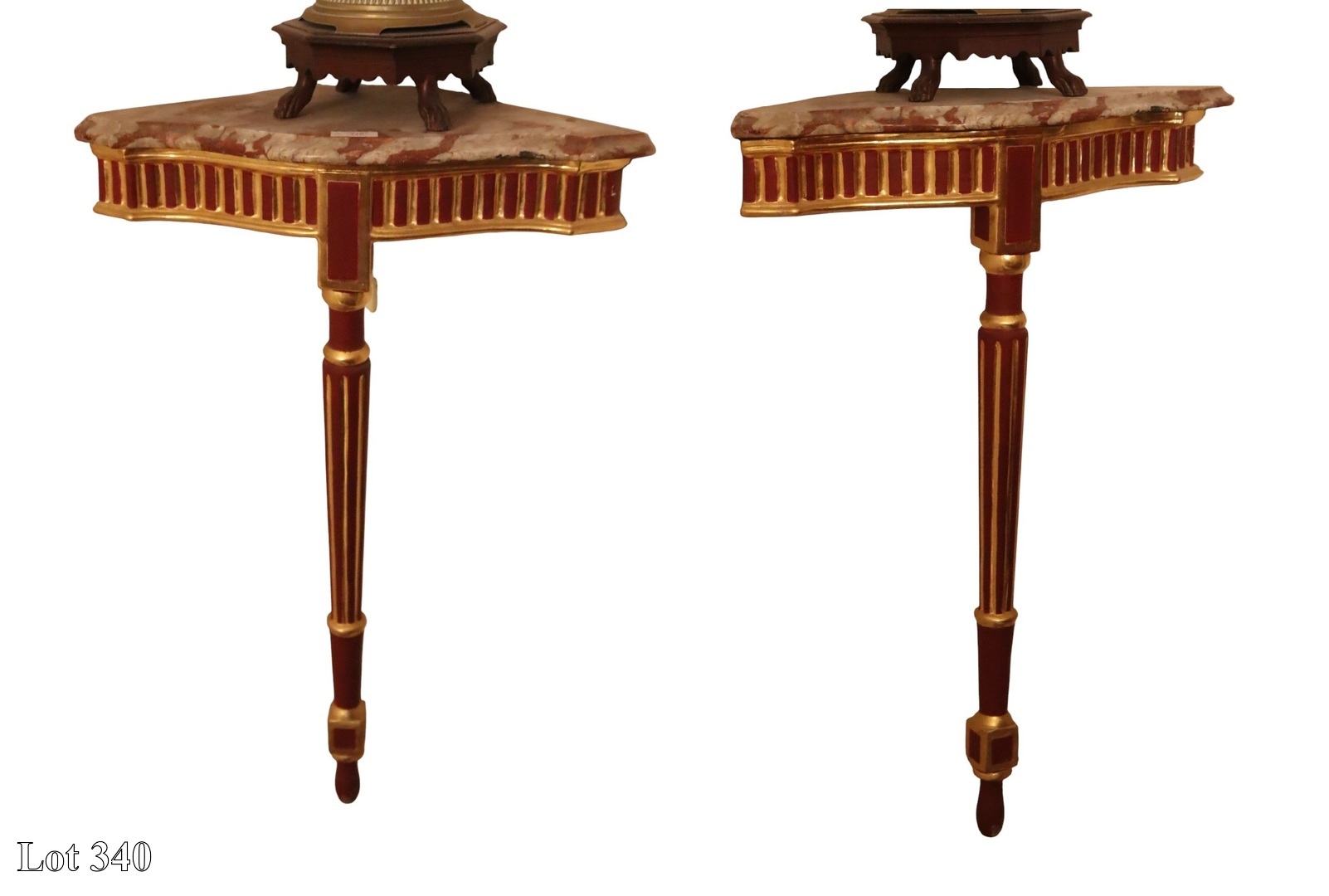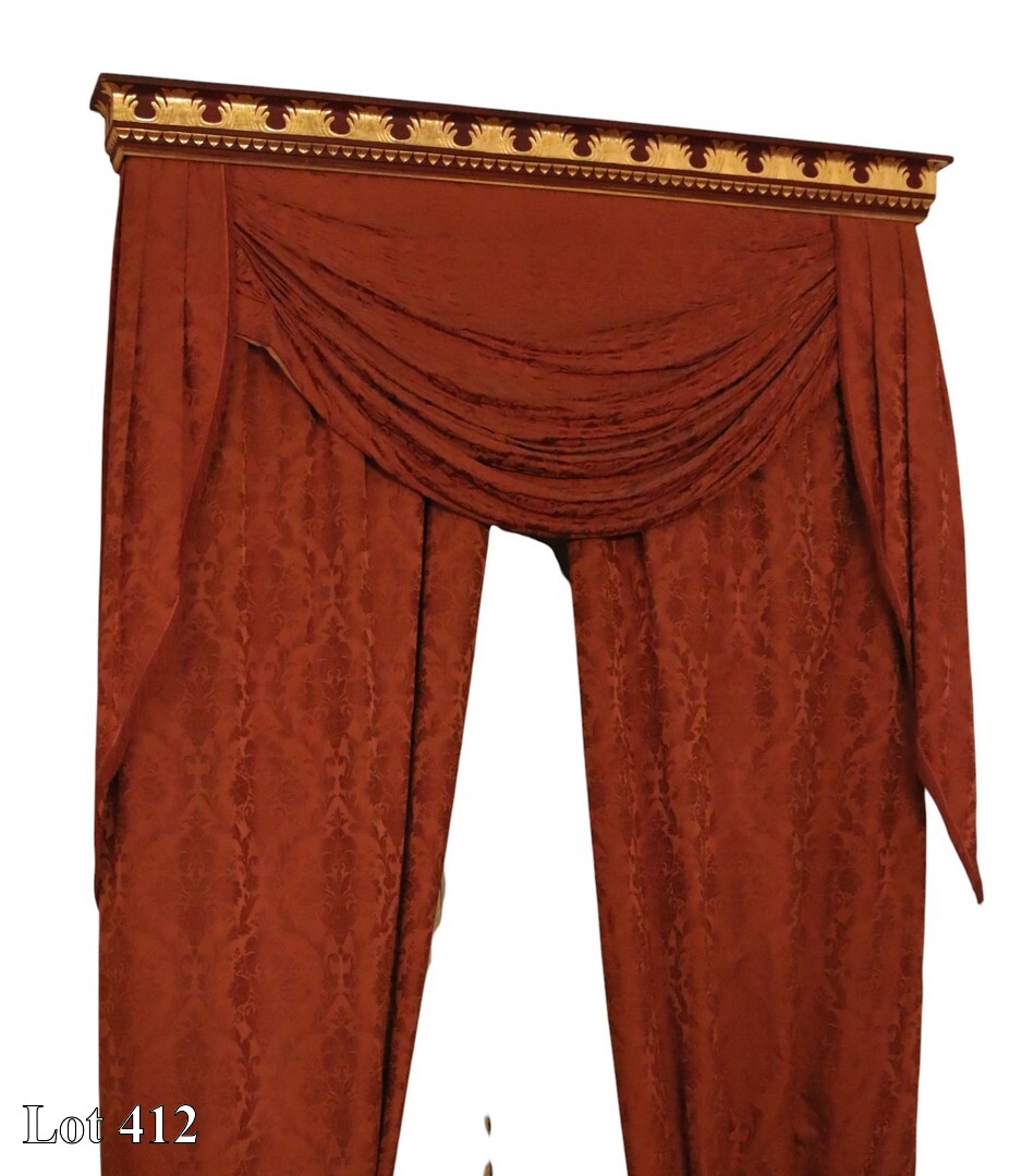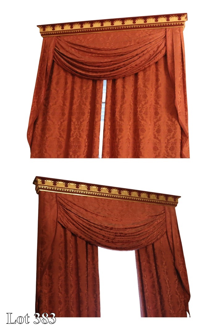 A pair of painted and gilded pelmets, with damask curtains. ( Width:194 )