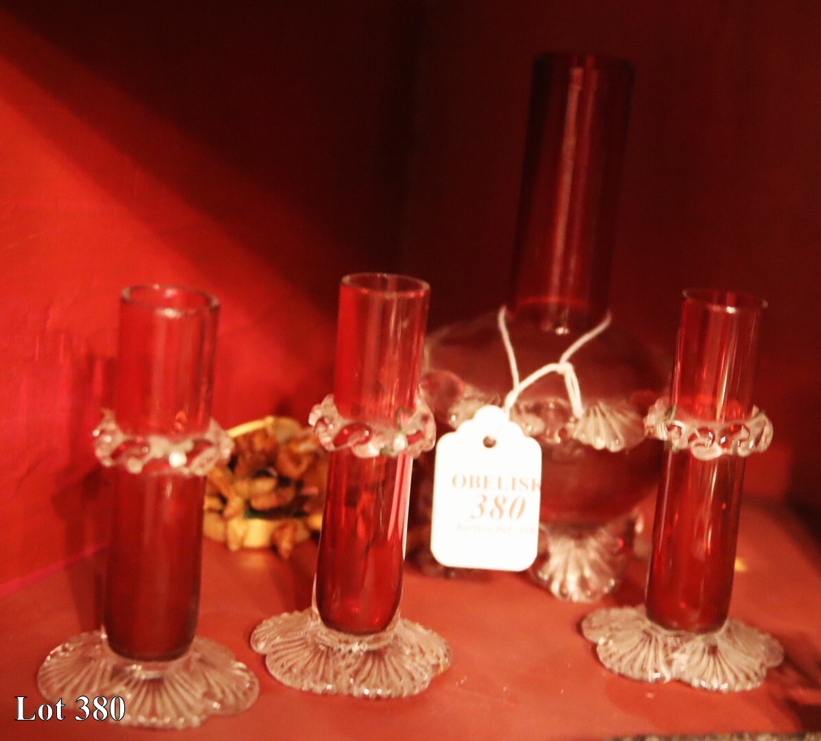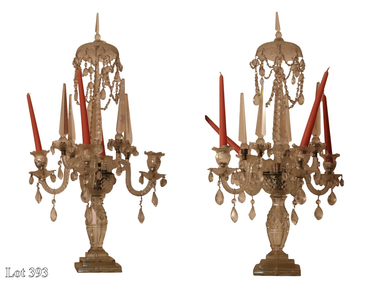Two red glass girandoles, with prismatic drops. ( Height:33 )