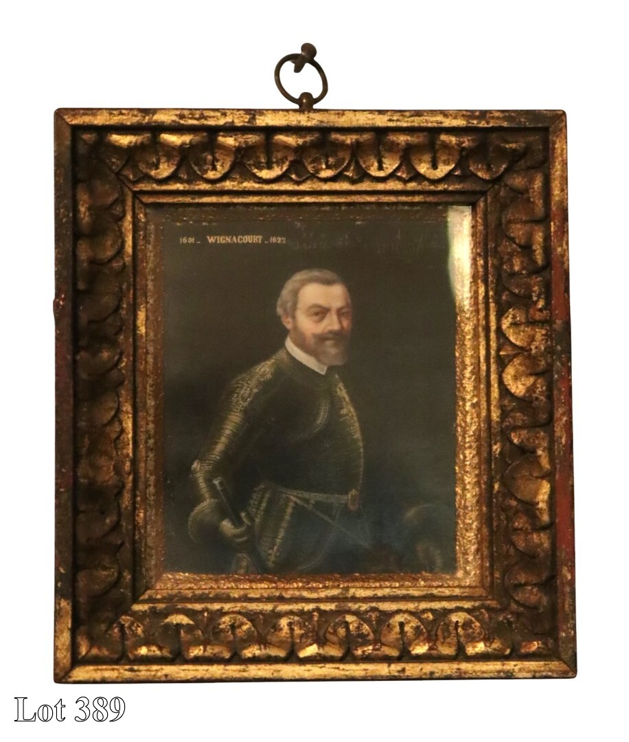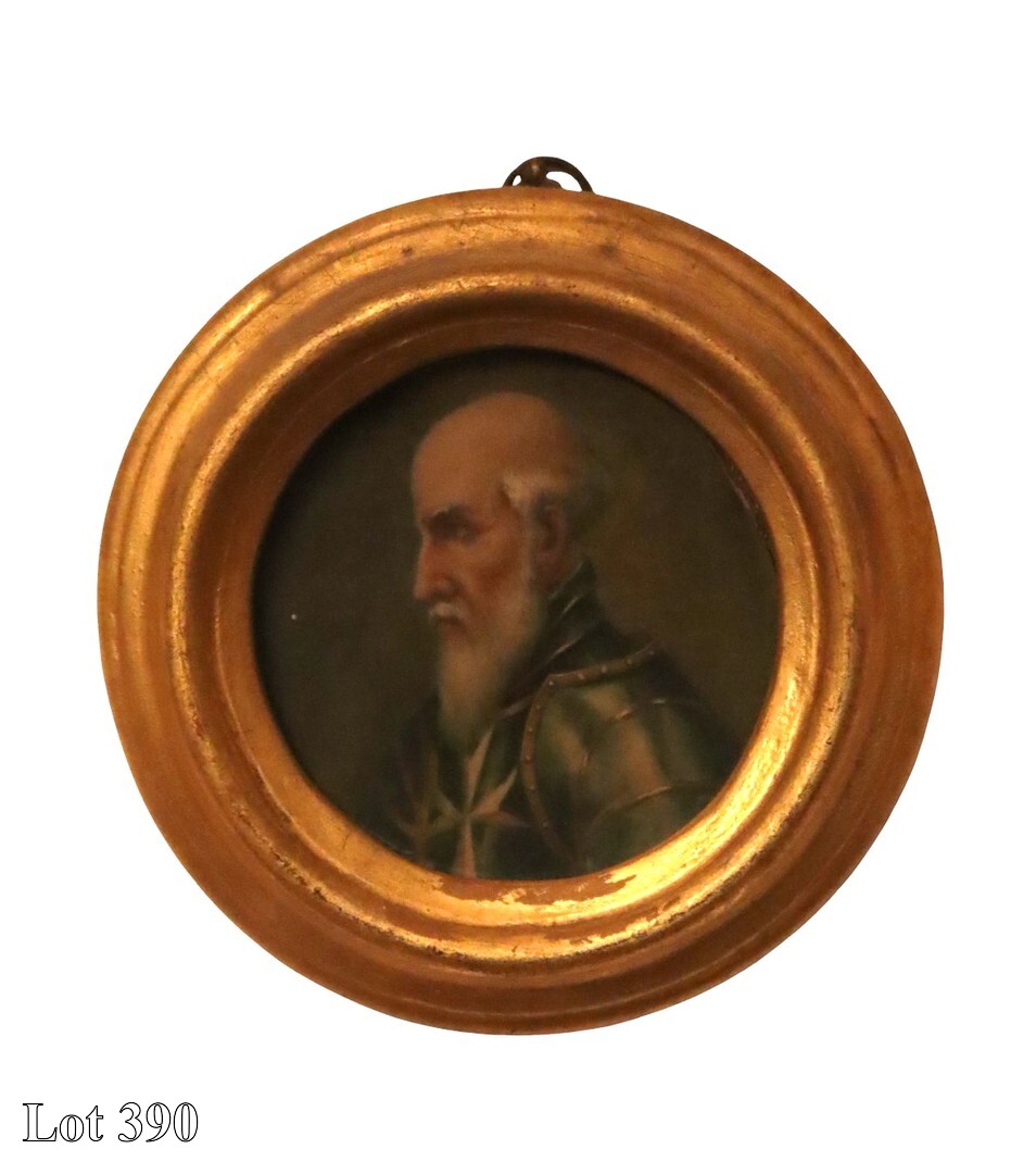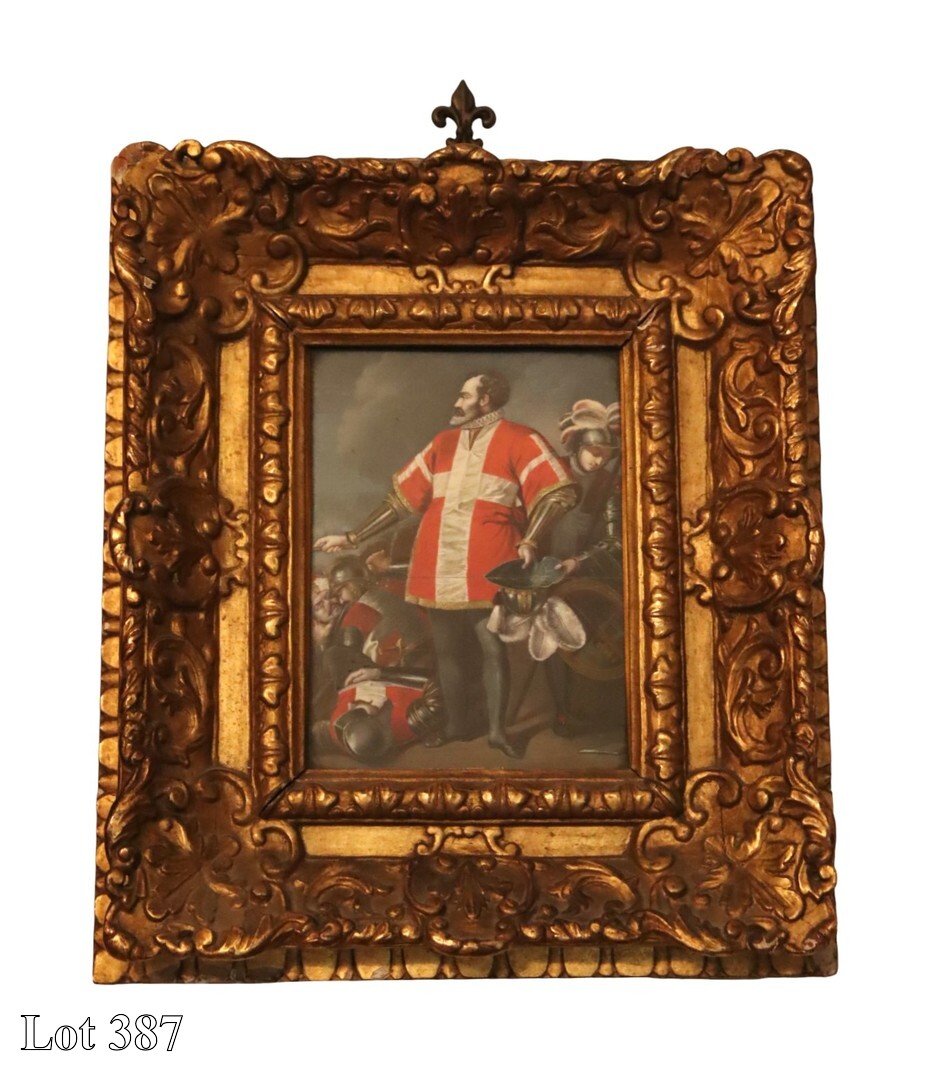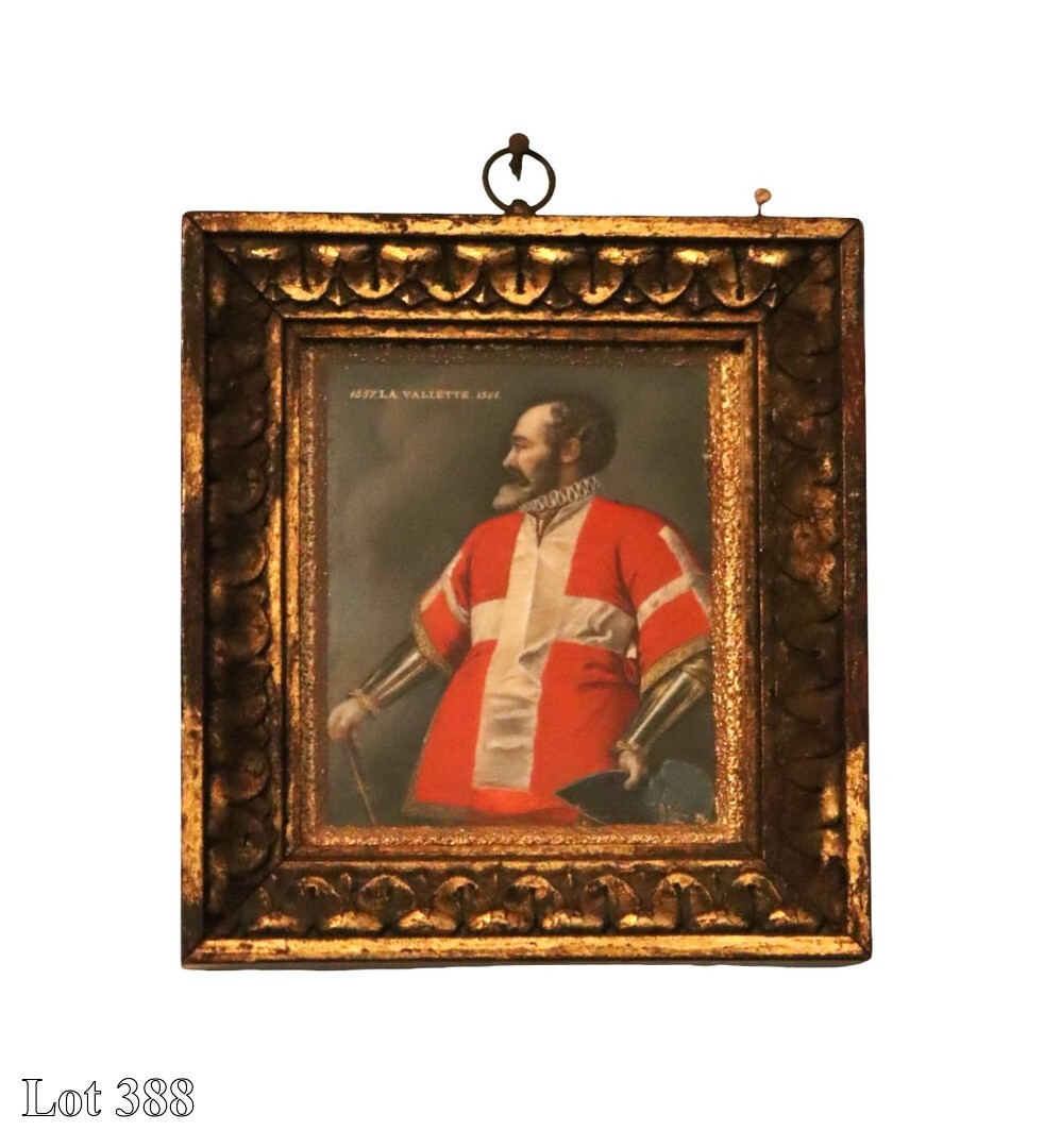 A Portrait of Grand Master Jean de La Valette, mixed media, in ornate gilded frame, possibly by Aspetti. ( Width:28 Height:32 )