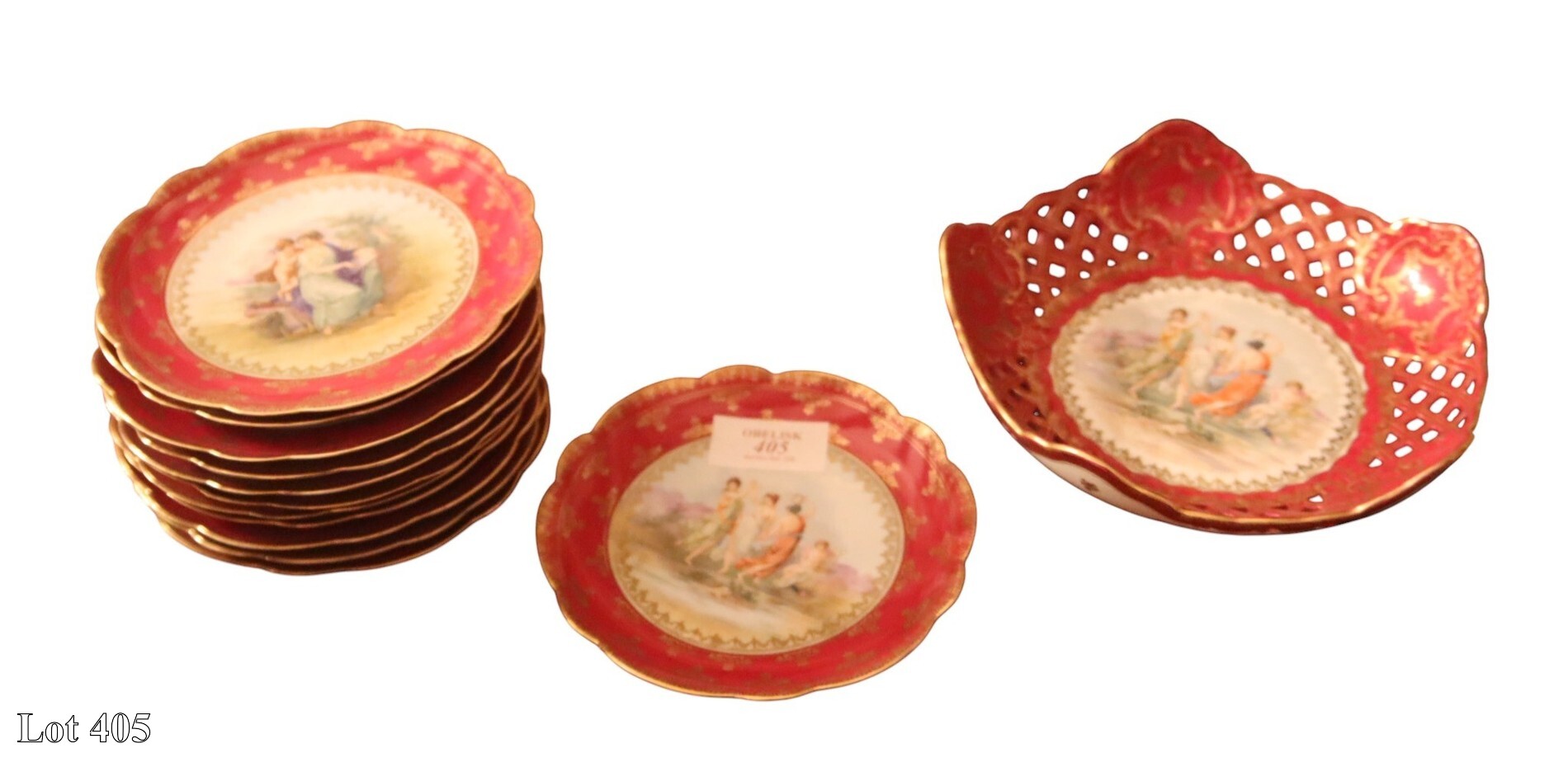 A set of twelve French plates with gilded and red borders, centred with erotic figures.