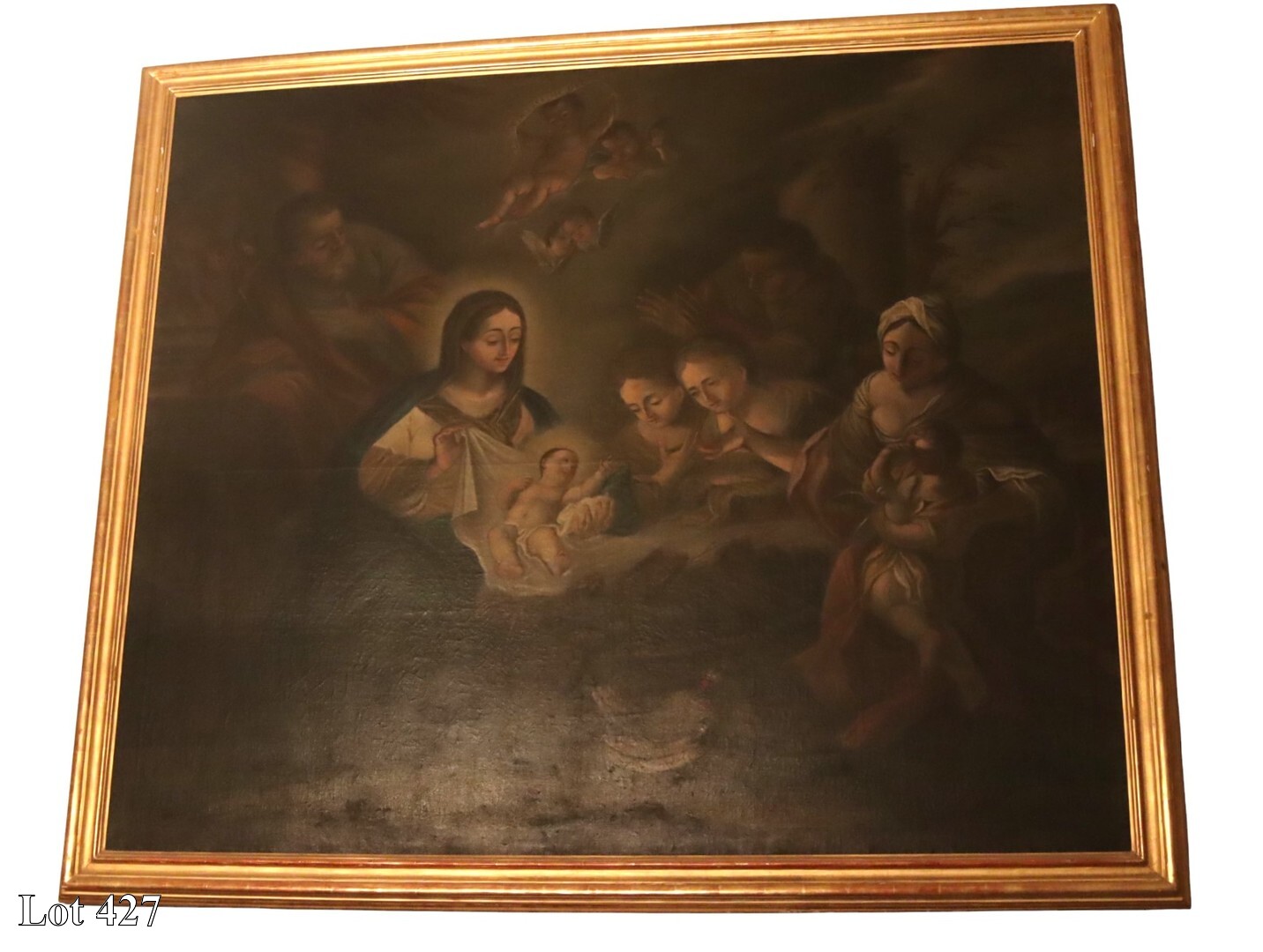 18th Century, The Nativity of Jesus with The Virgin Mary and St Joseph, oil on canvas, in gilded frame. ( Width:212 Height:170 )