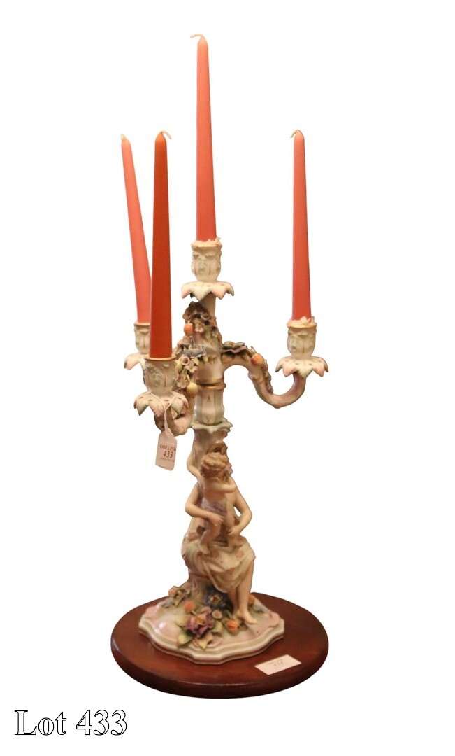 19th Century four branch porcelain candelabra, with a natural scene of mother and child.