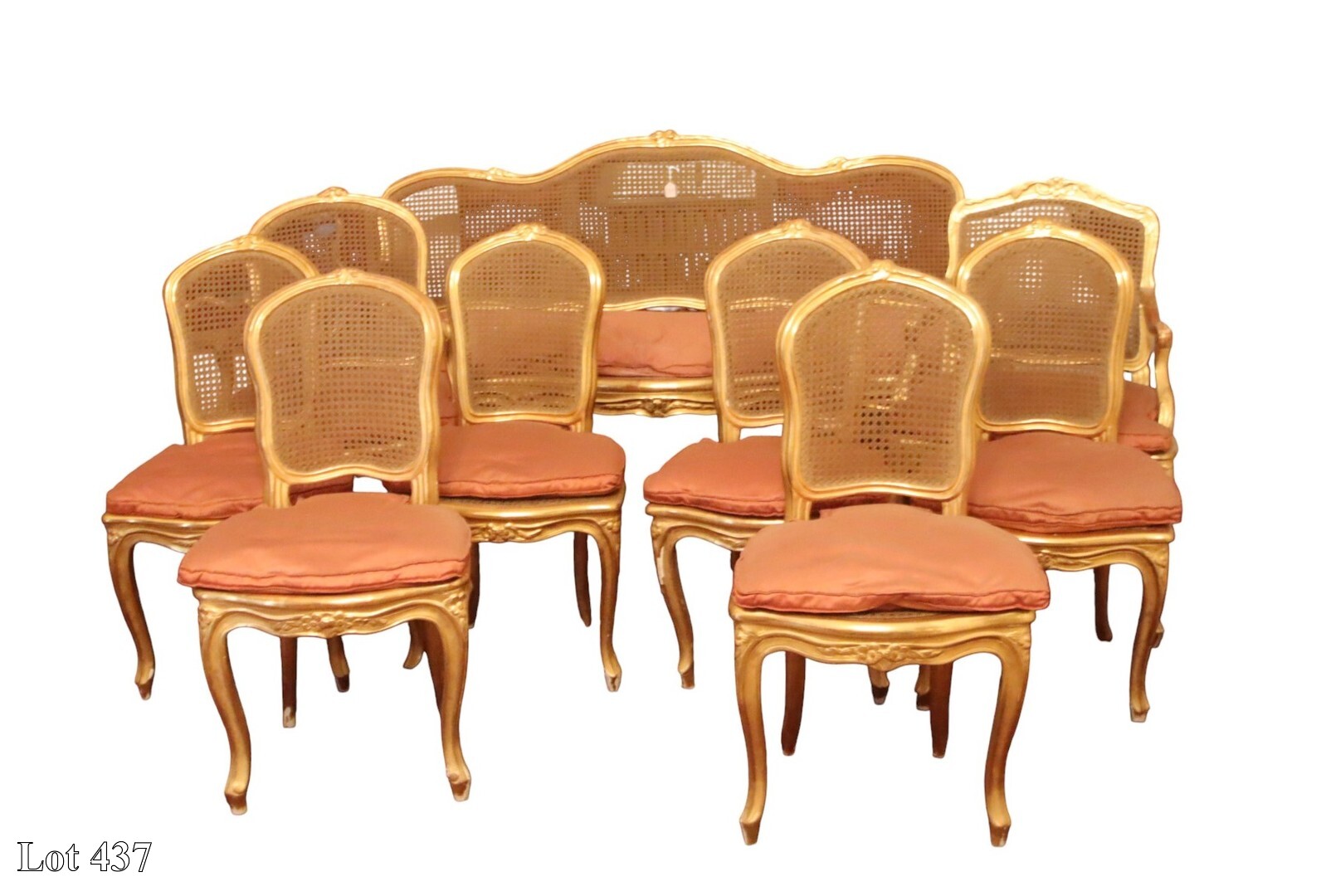 19th Century carved wood gilded sitting suite comprising of a three seater sofa, two armchairs, and six chairs in cane seats on cabriole legs.