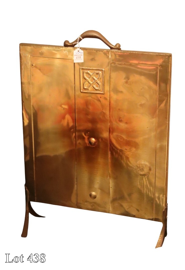 20th Century brass fire screen, fire guard, coal scuttle and fire place tools.