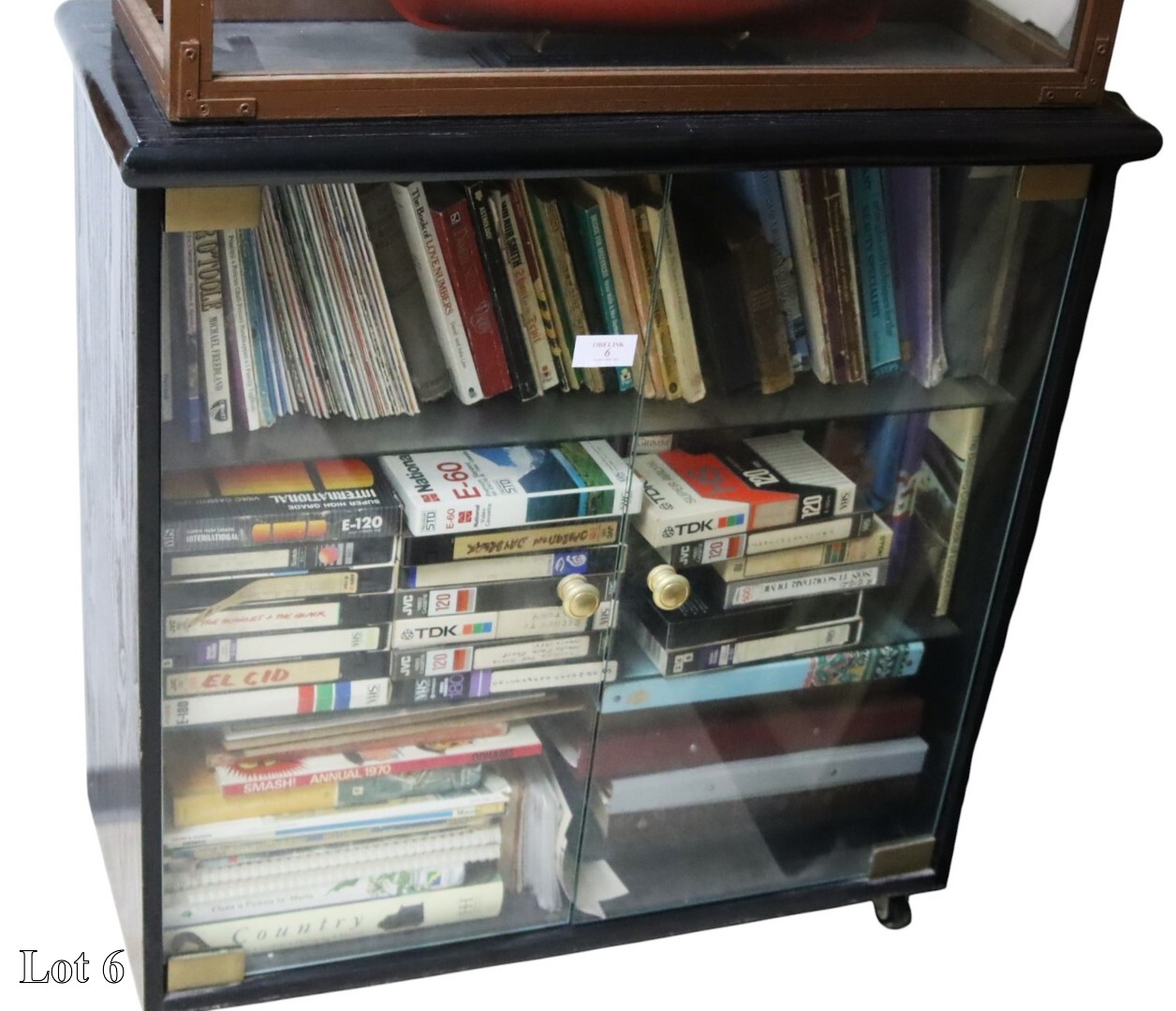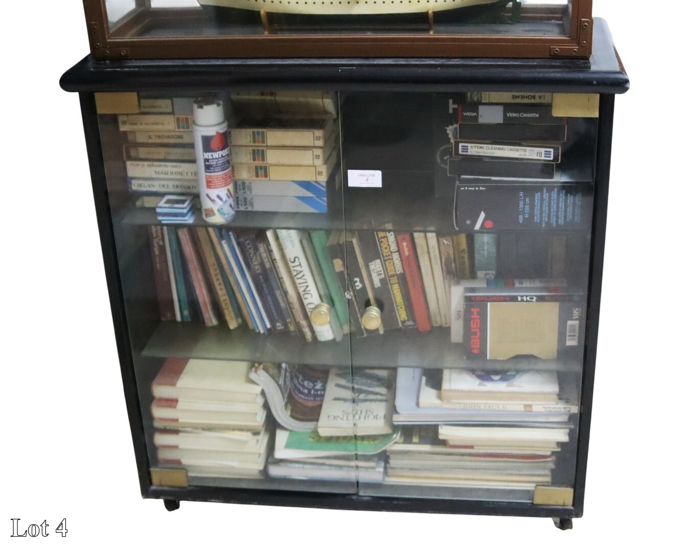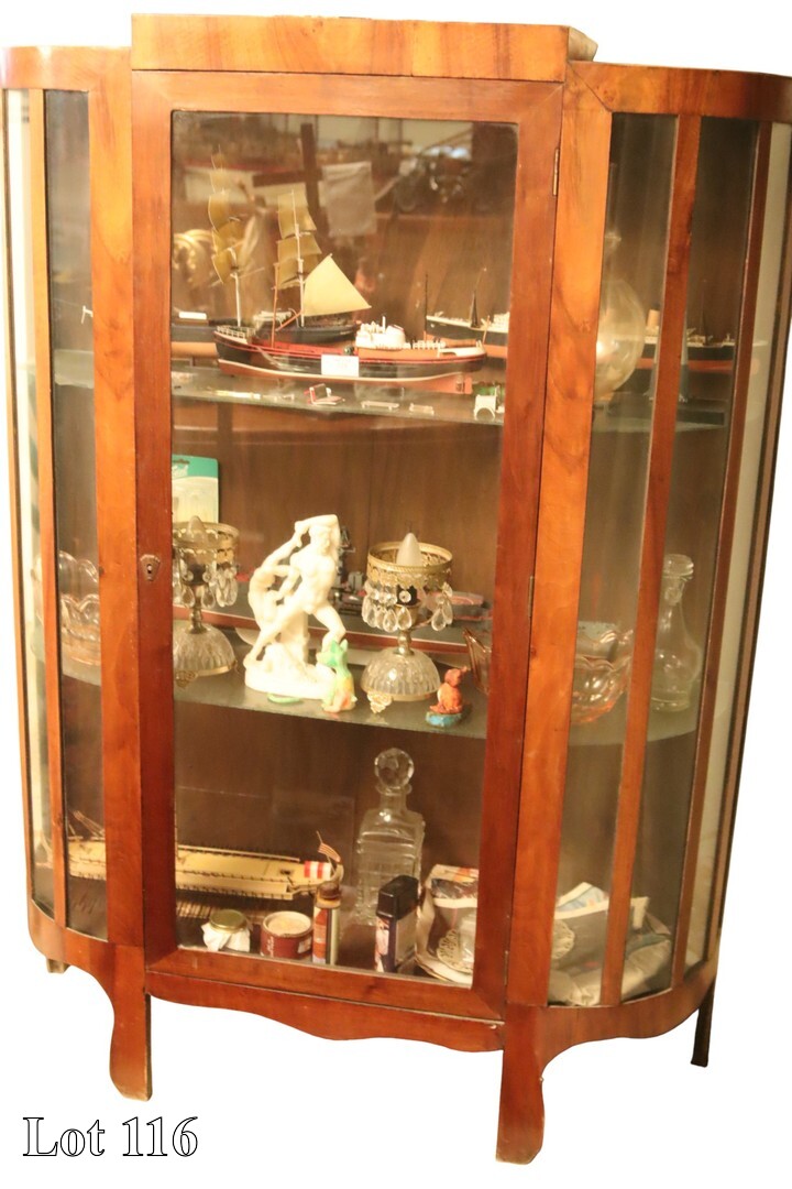 Two door glass cabinet with miscellaneous items. ( Width:80 Height:82 Depth:33)