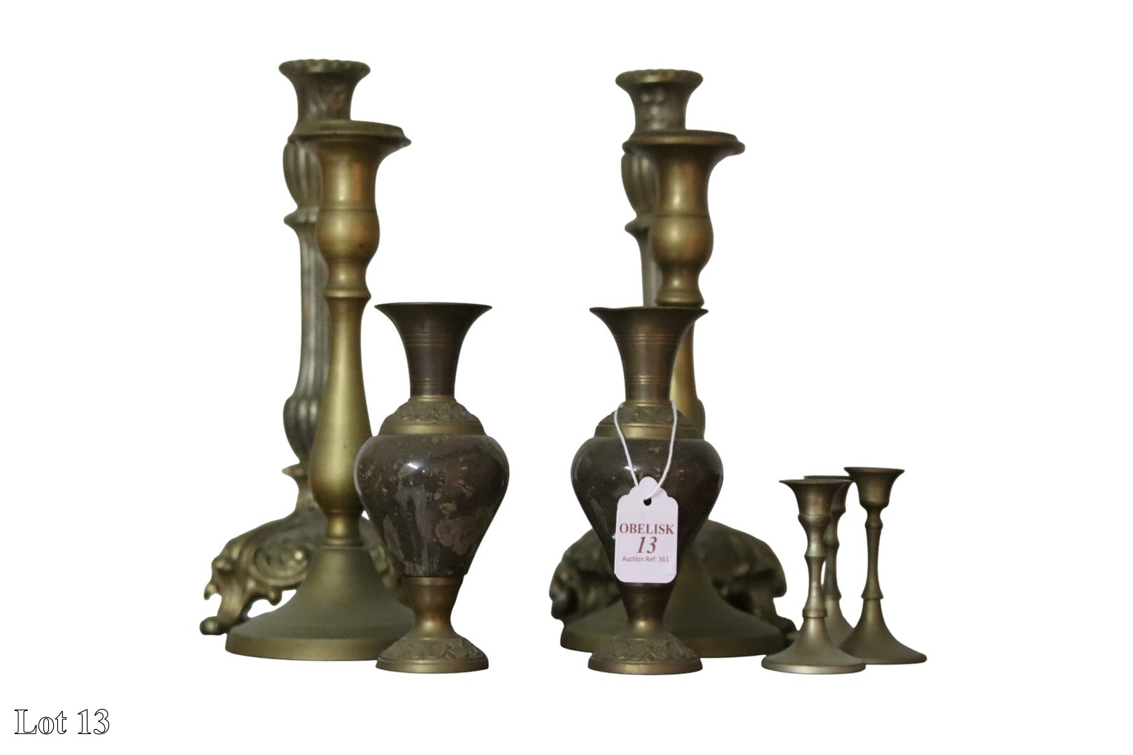 Two pairs of brass candle sticks and vases.