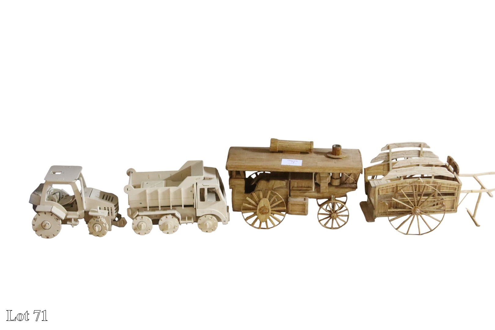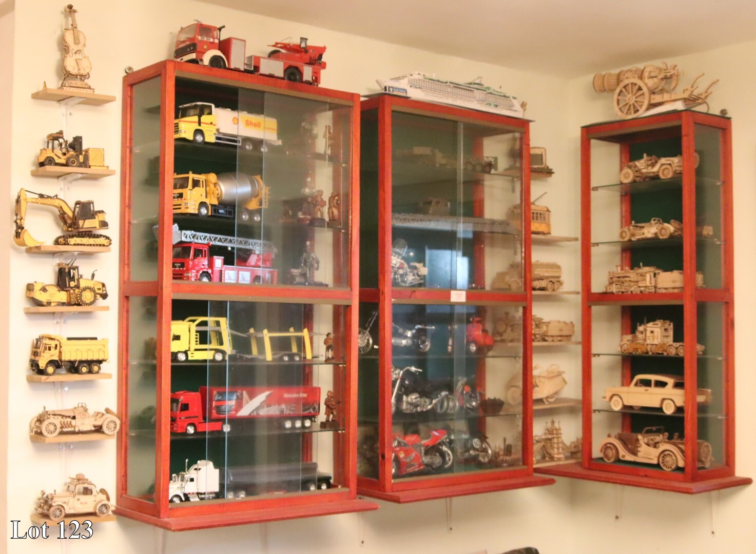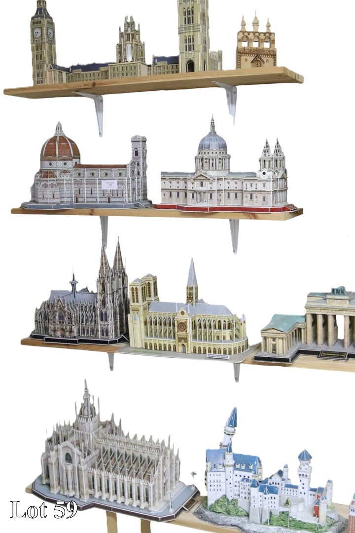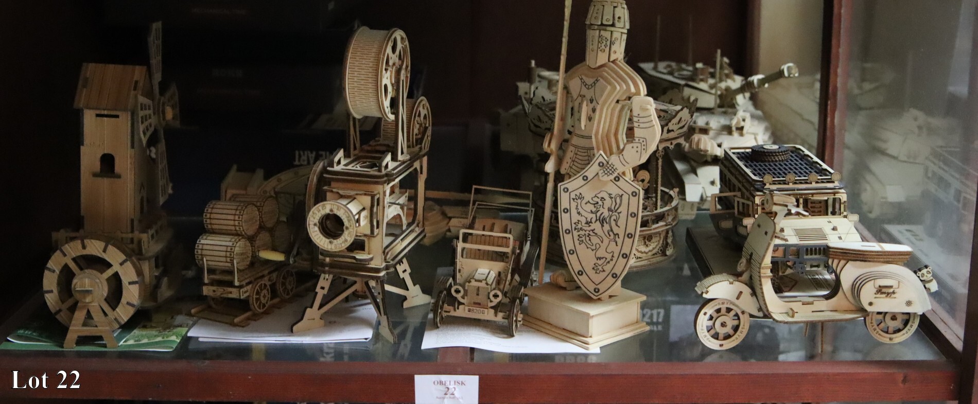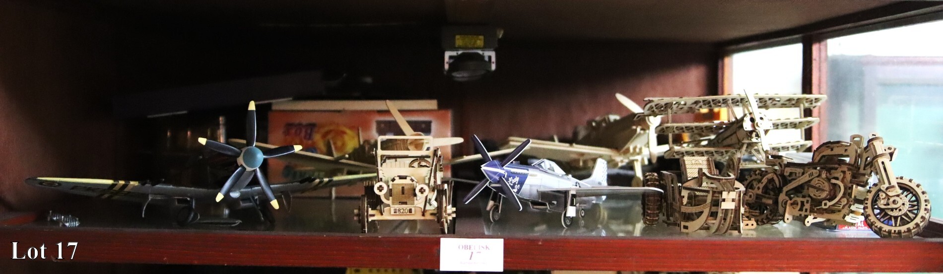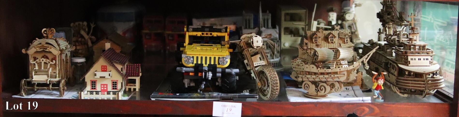 An assorted lot of wooden assembled models on shelf.