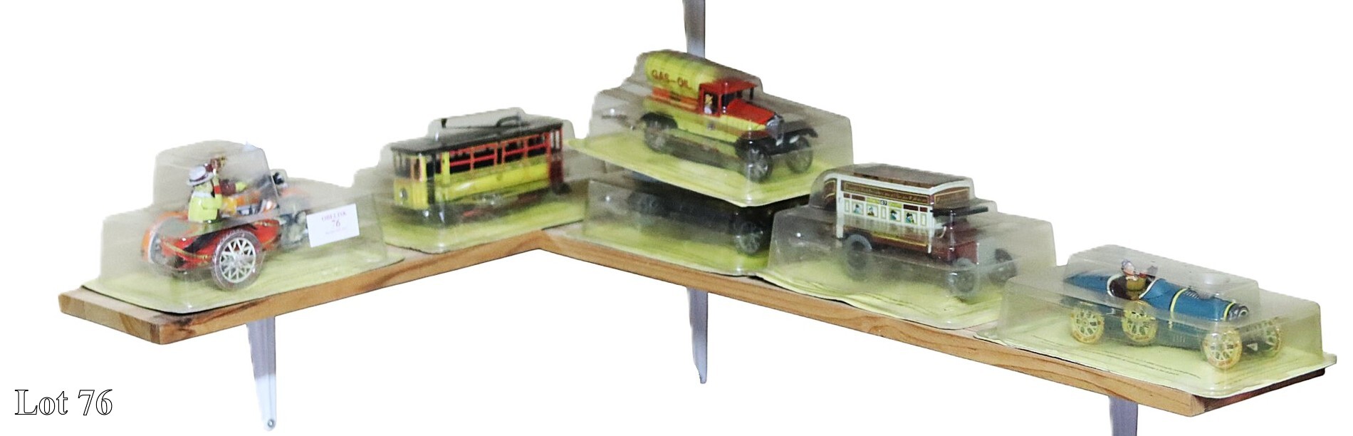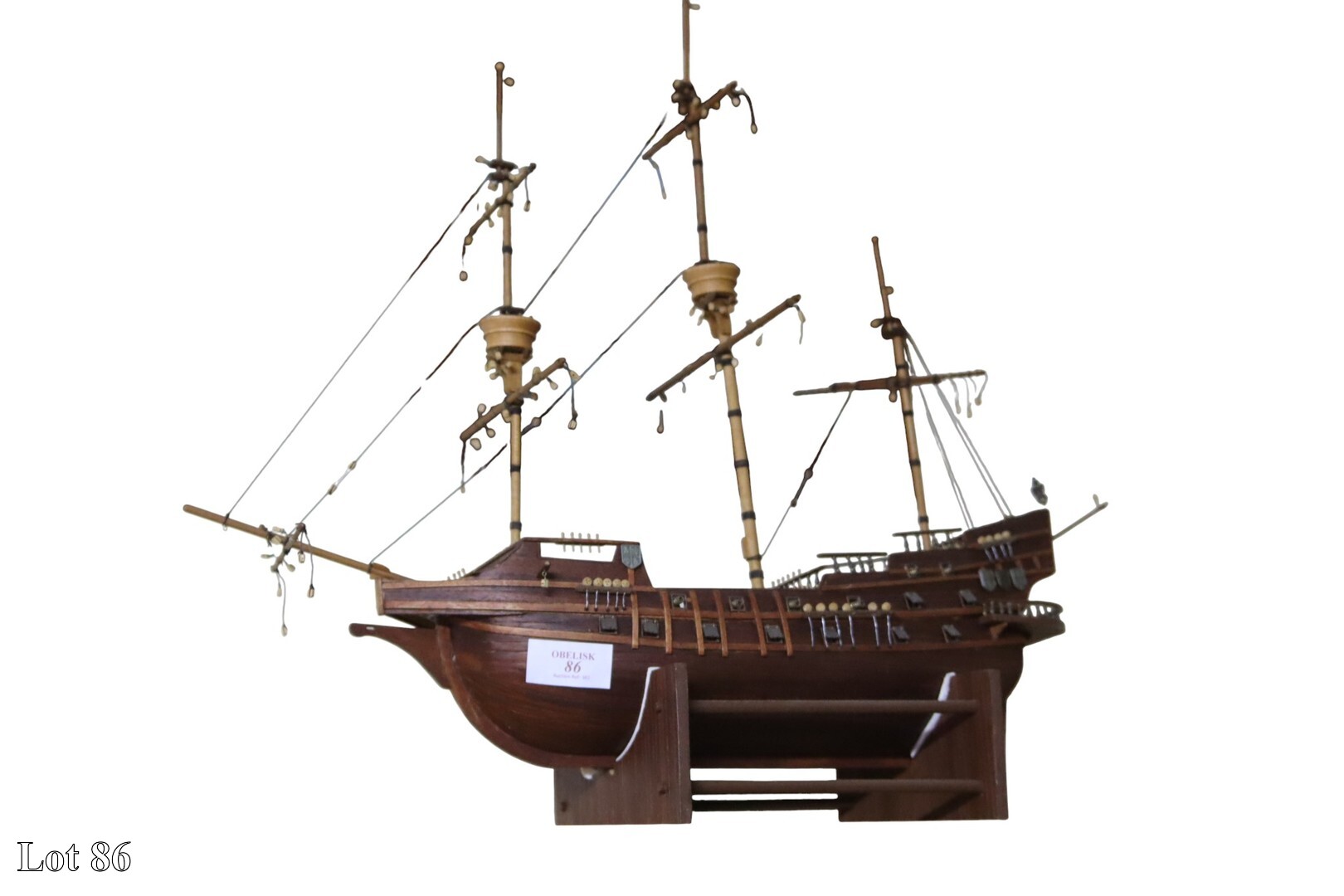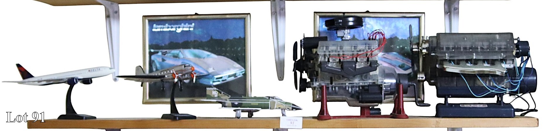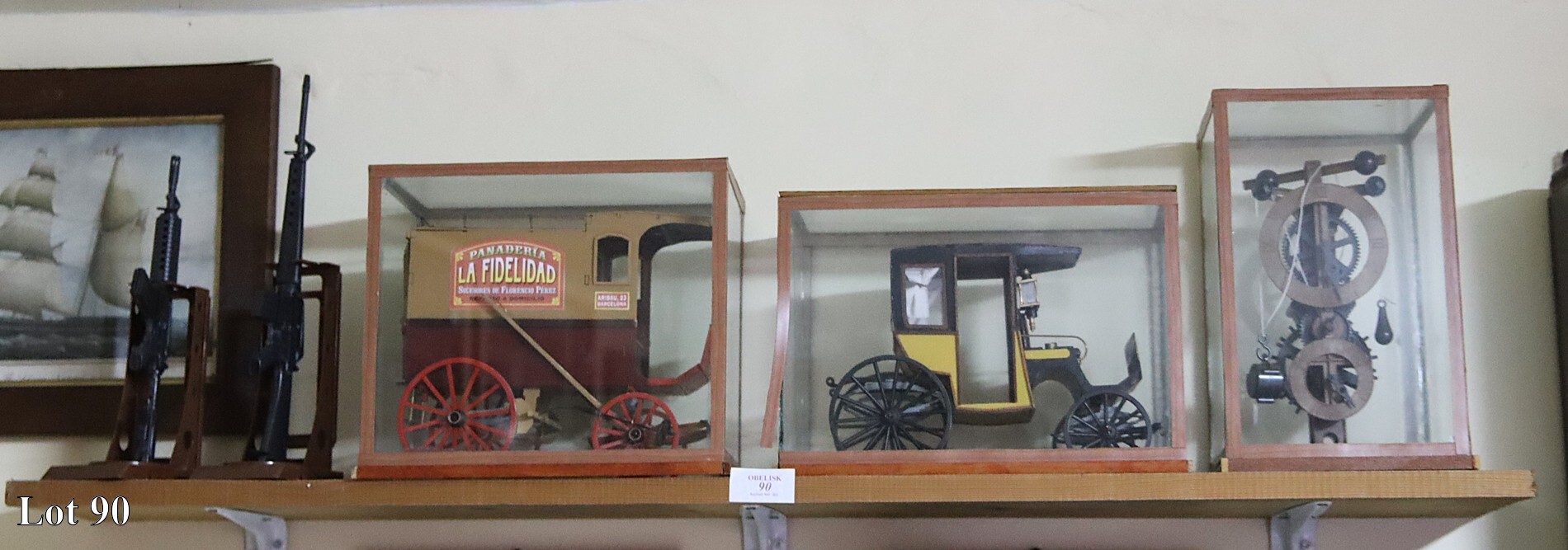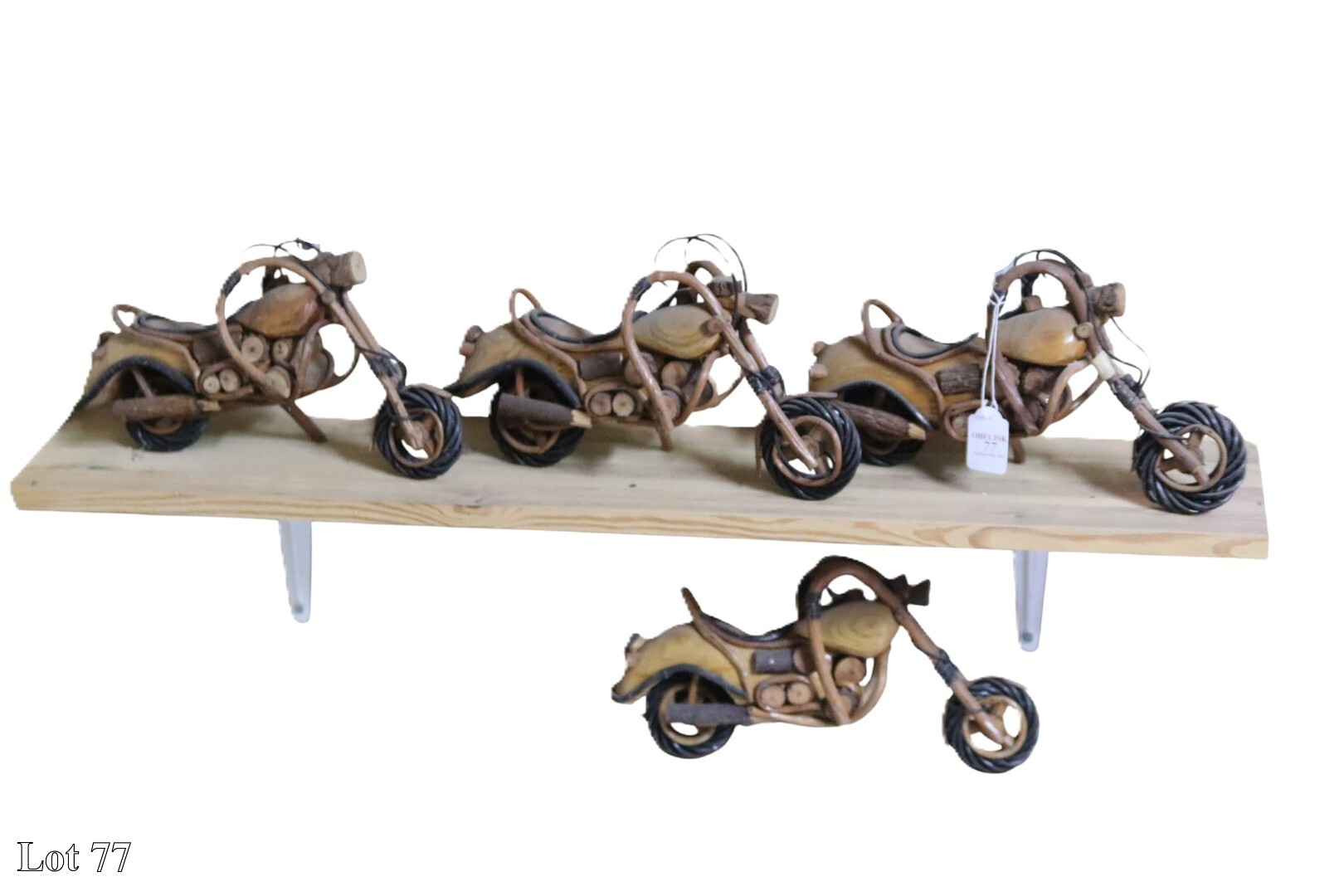 An assorted lot of wooden assembled models on shelf.