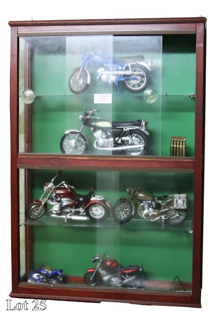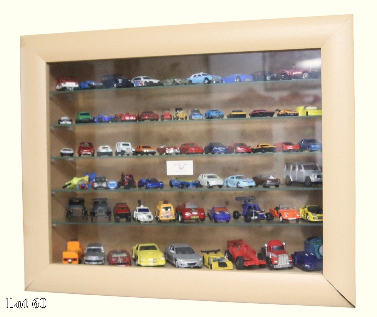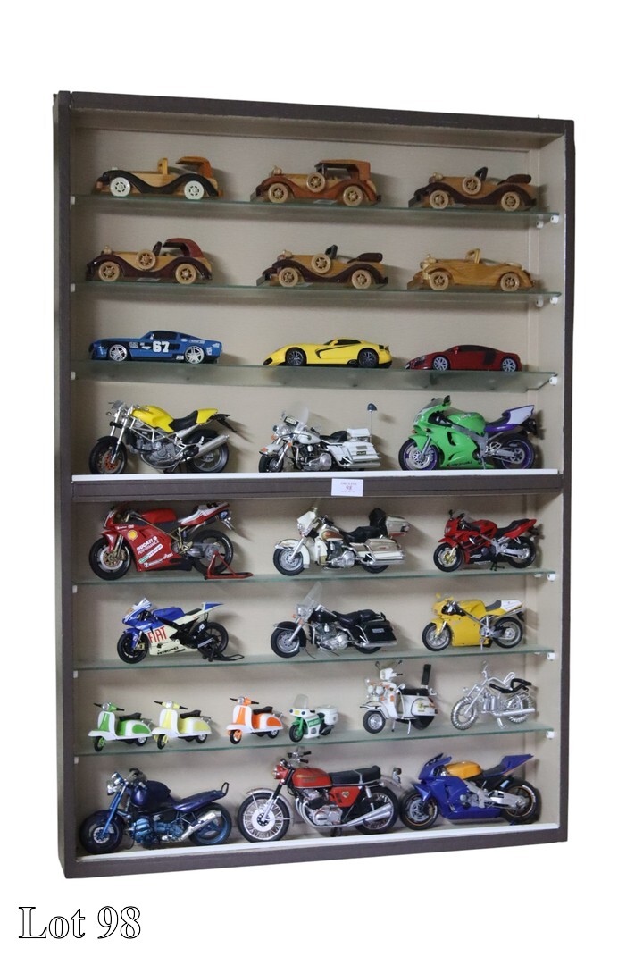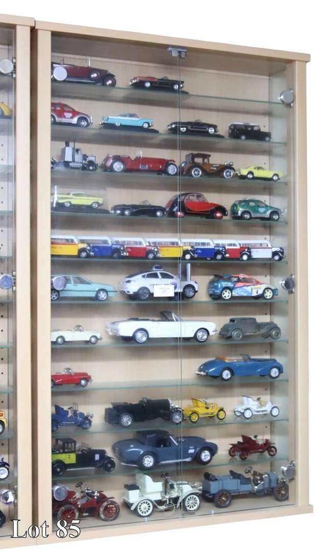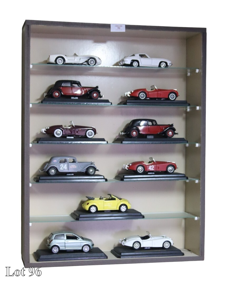 A collection of car models, in wall mounted cabinet, with glass shelves.