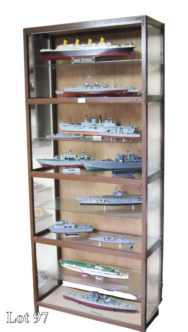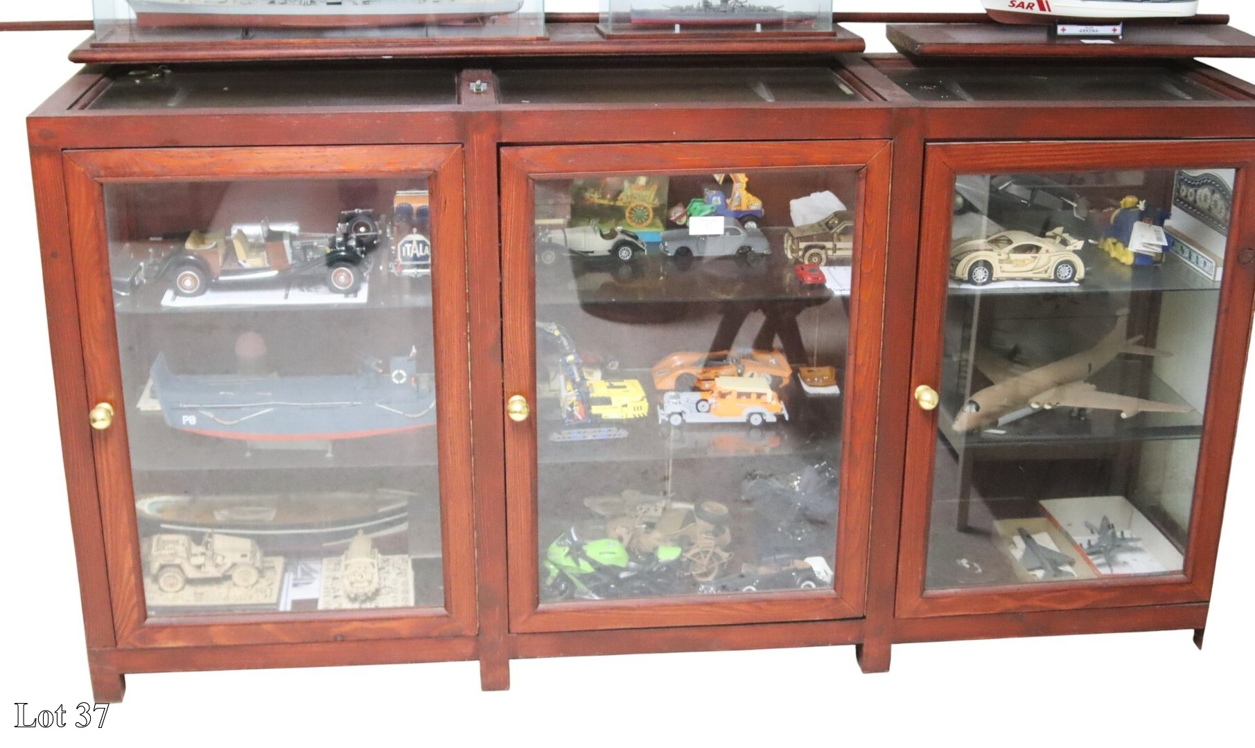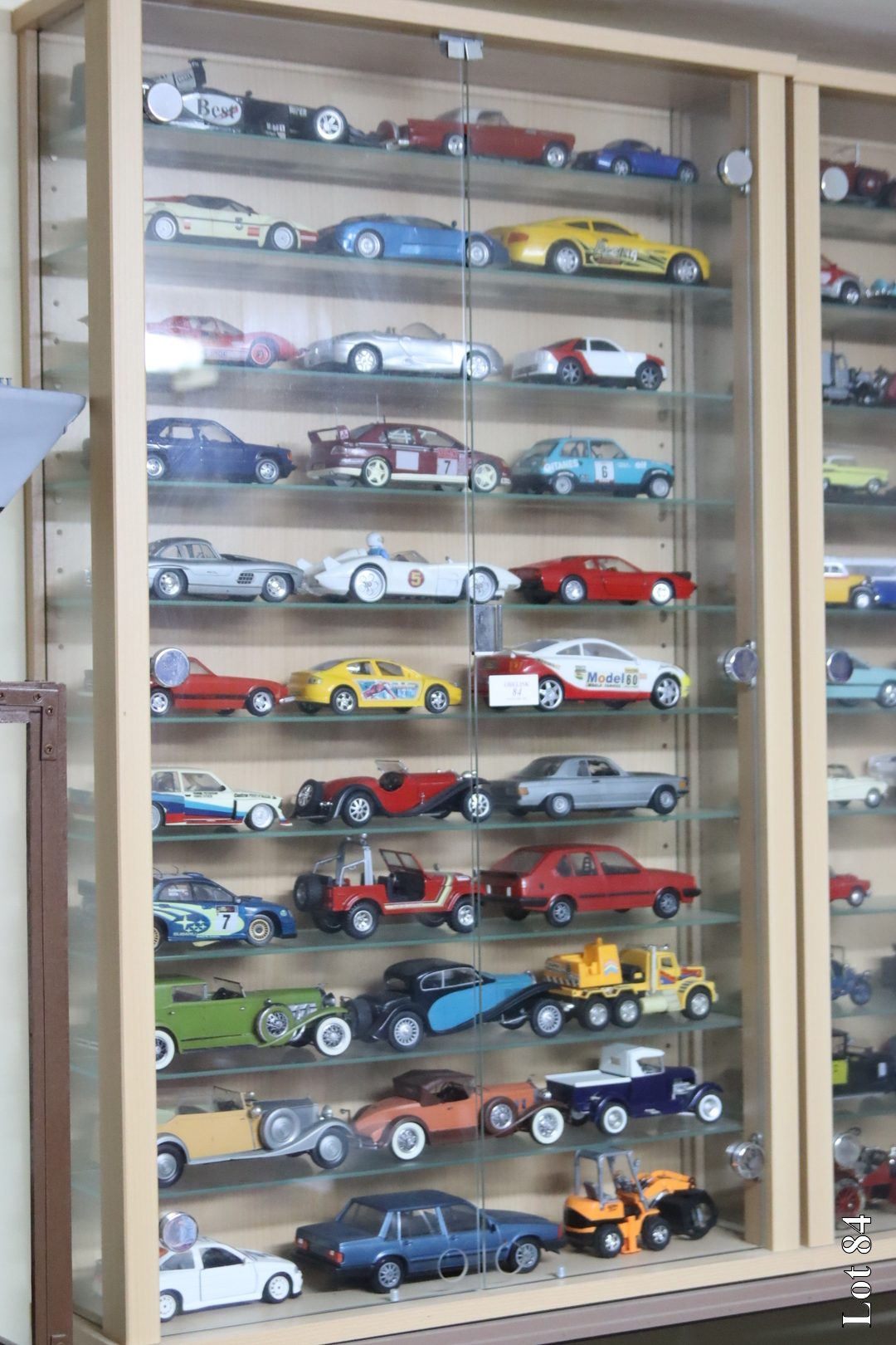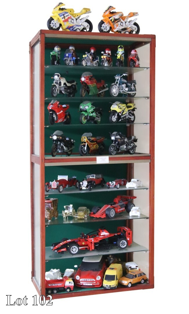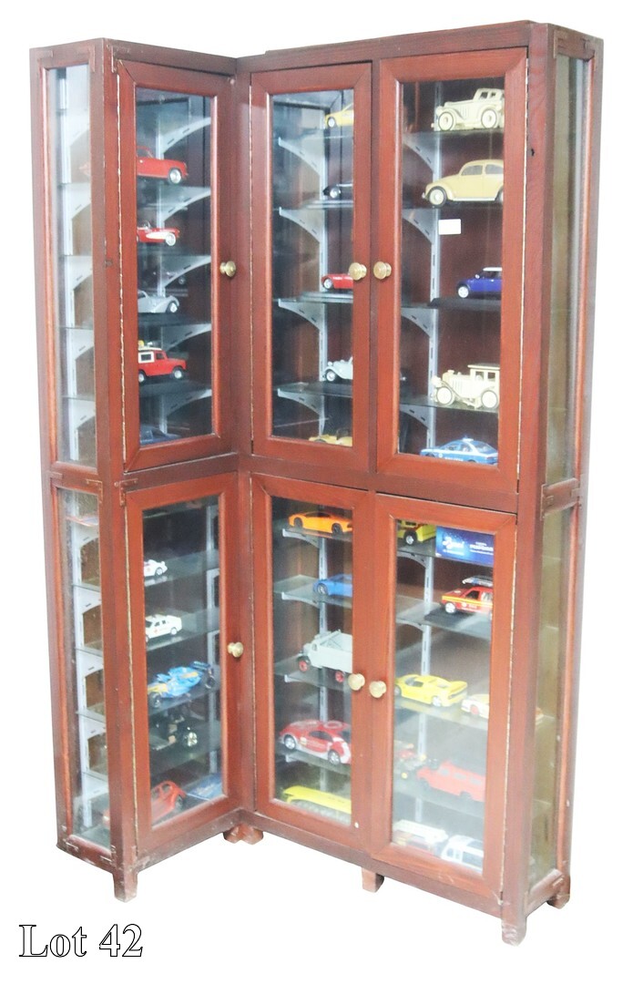 A collection of car models, with an L shaped display cabinet,