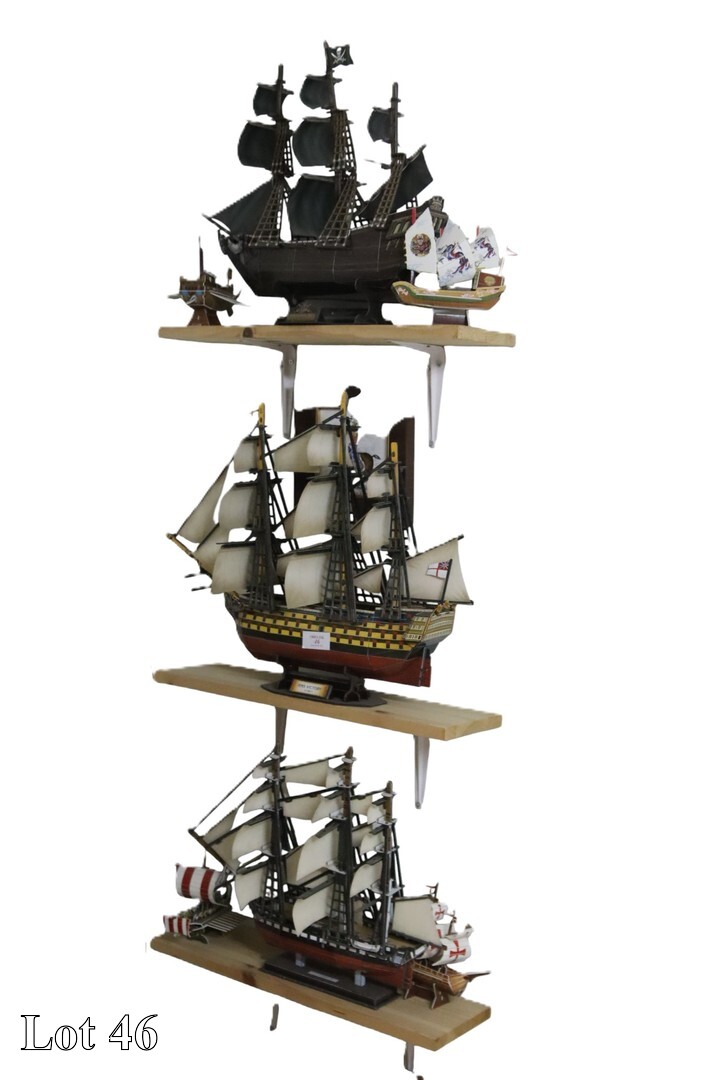 A collection of cardboard ship models, on three shelves.