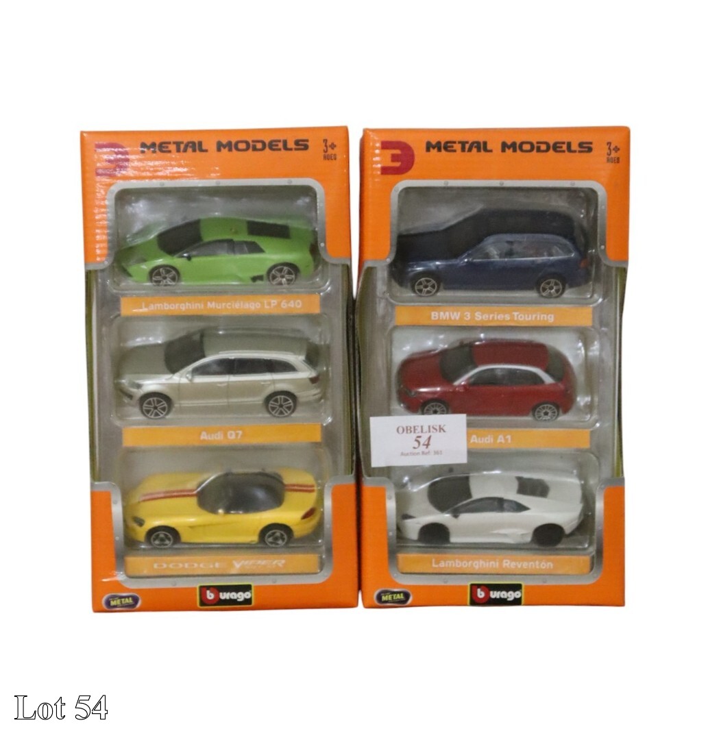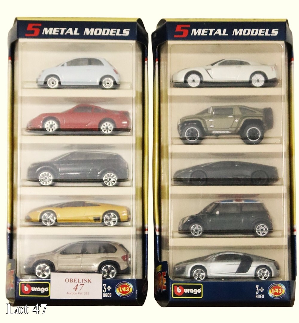 Ten Burago, metal models, in two original boxes.