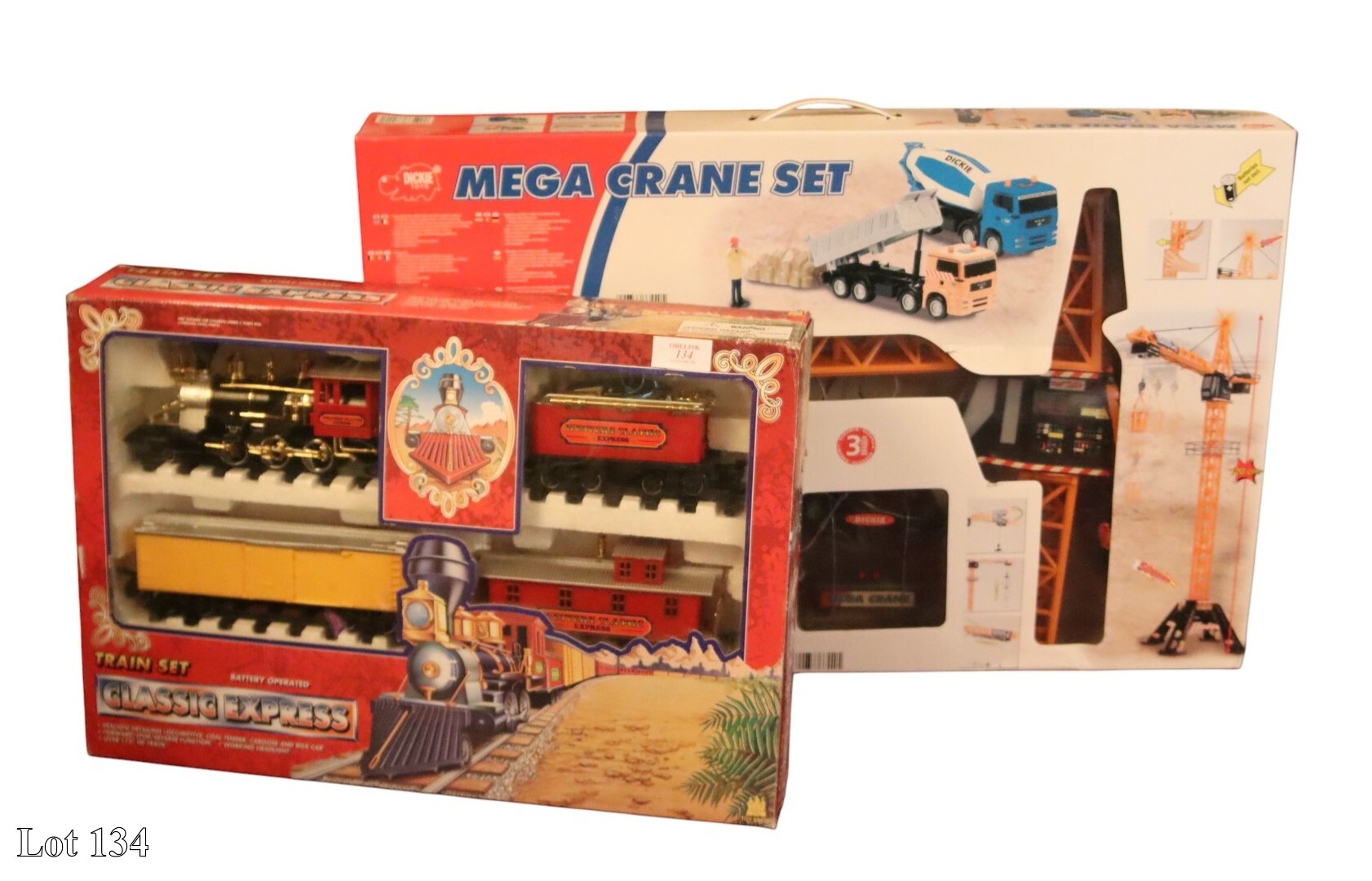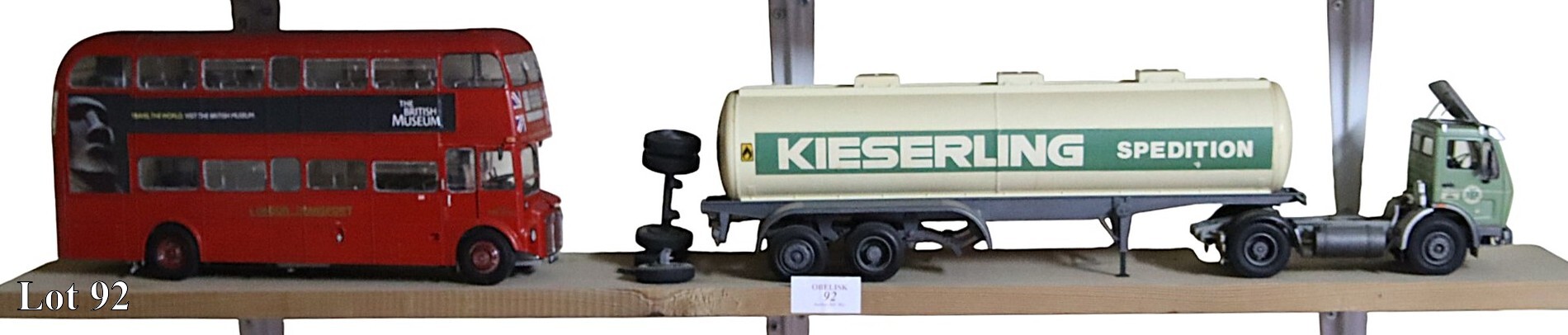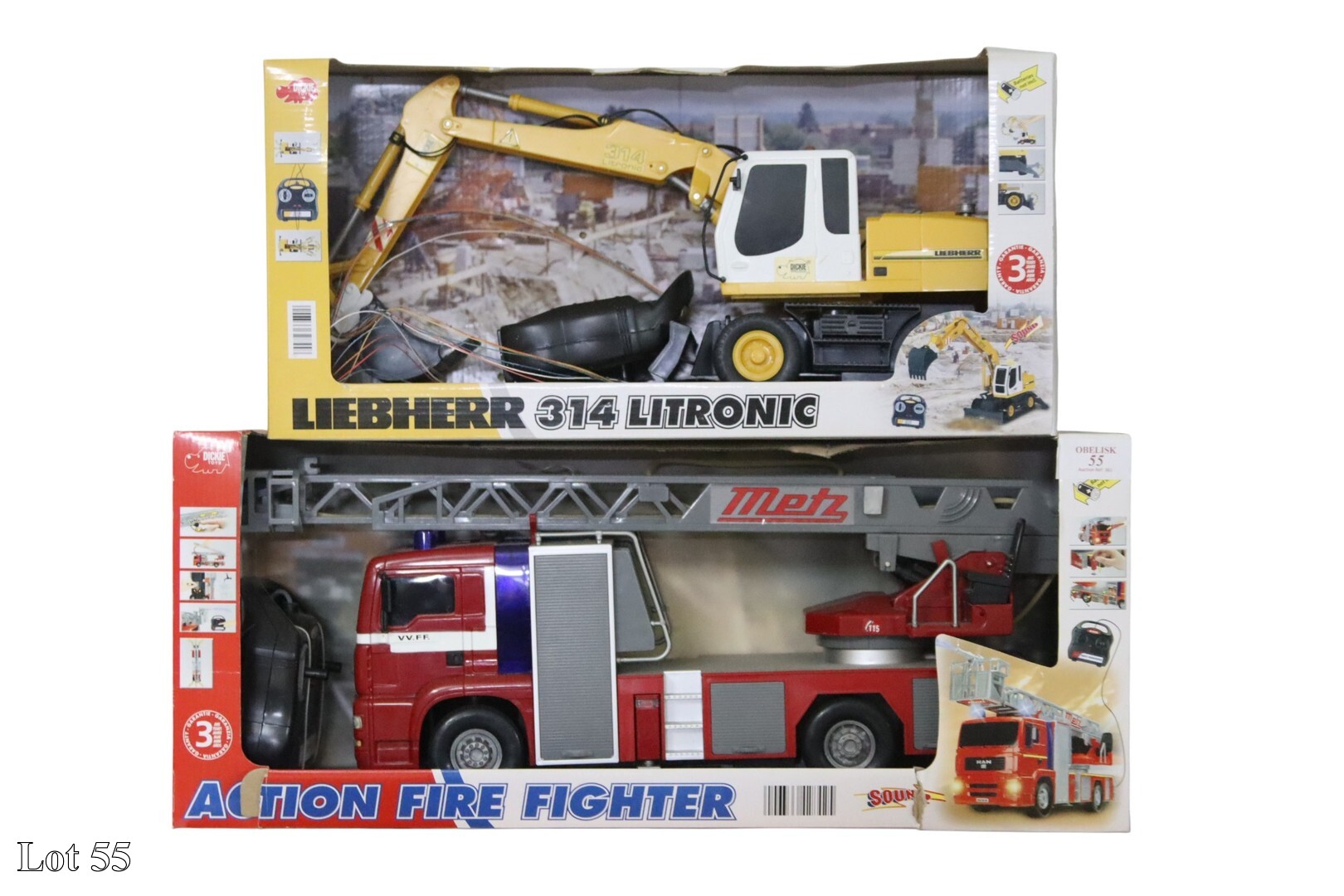 Two remote control fire engines and an excavator.