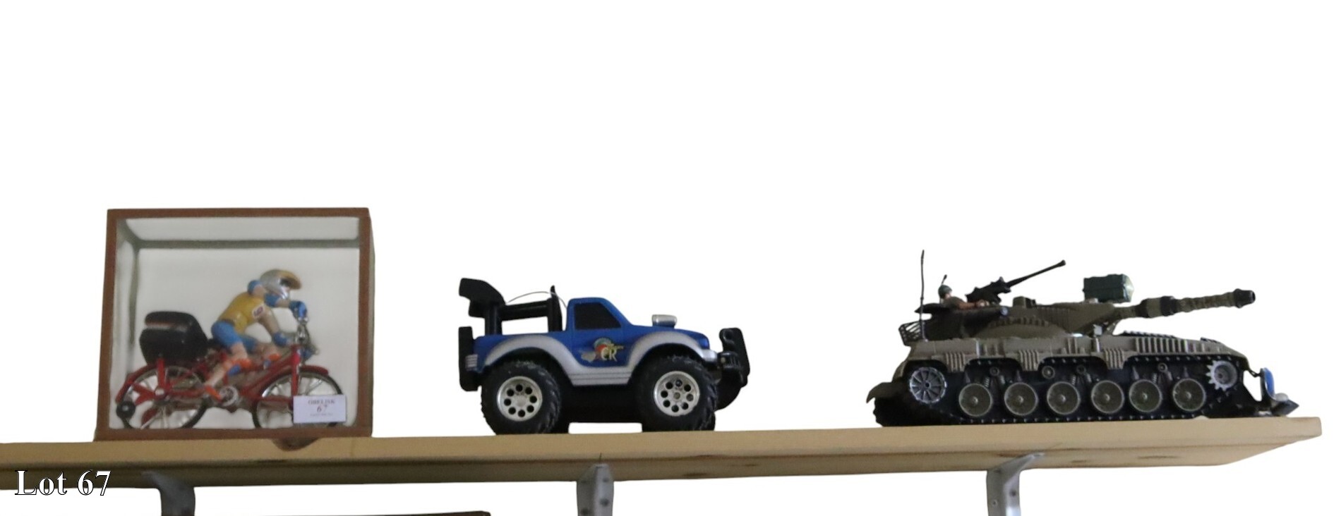 A model of a girl riding her bike, off roader and a war tank.