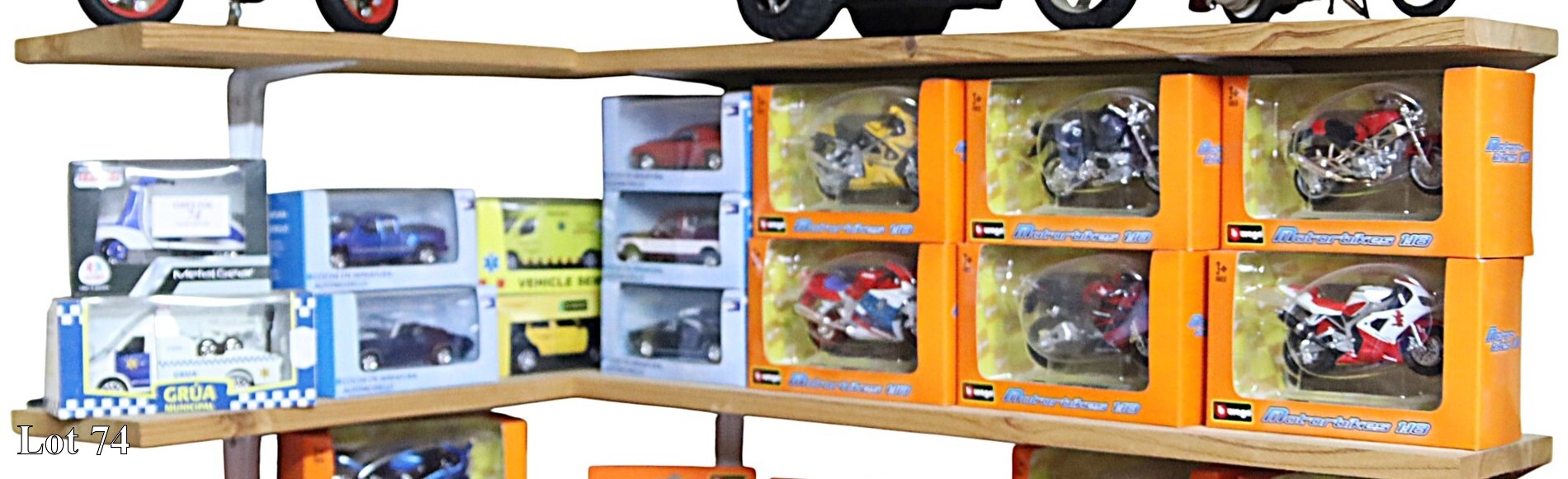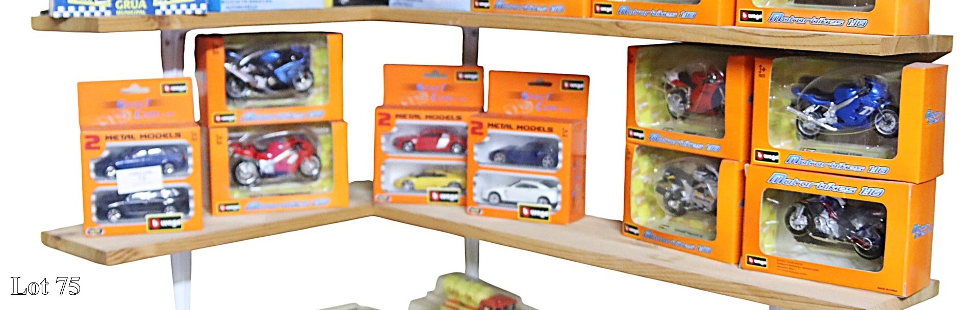 A collection of Burago cars and racing motorcycles.