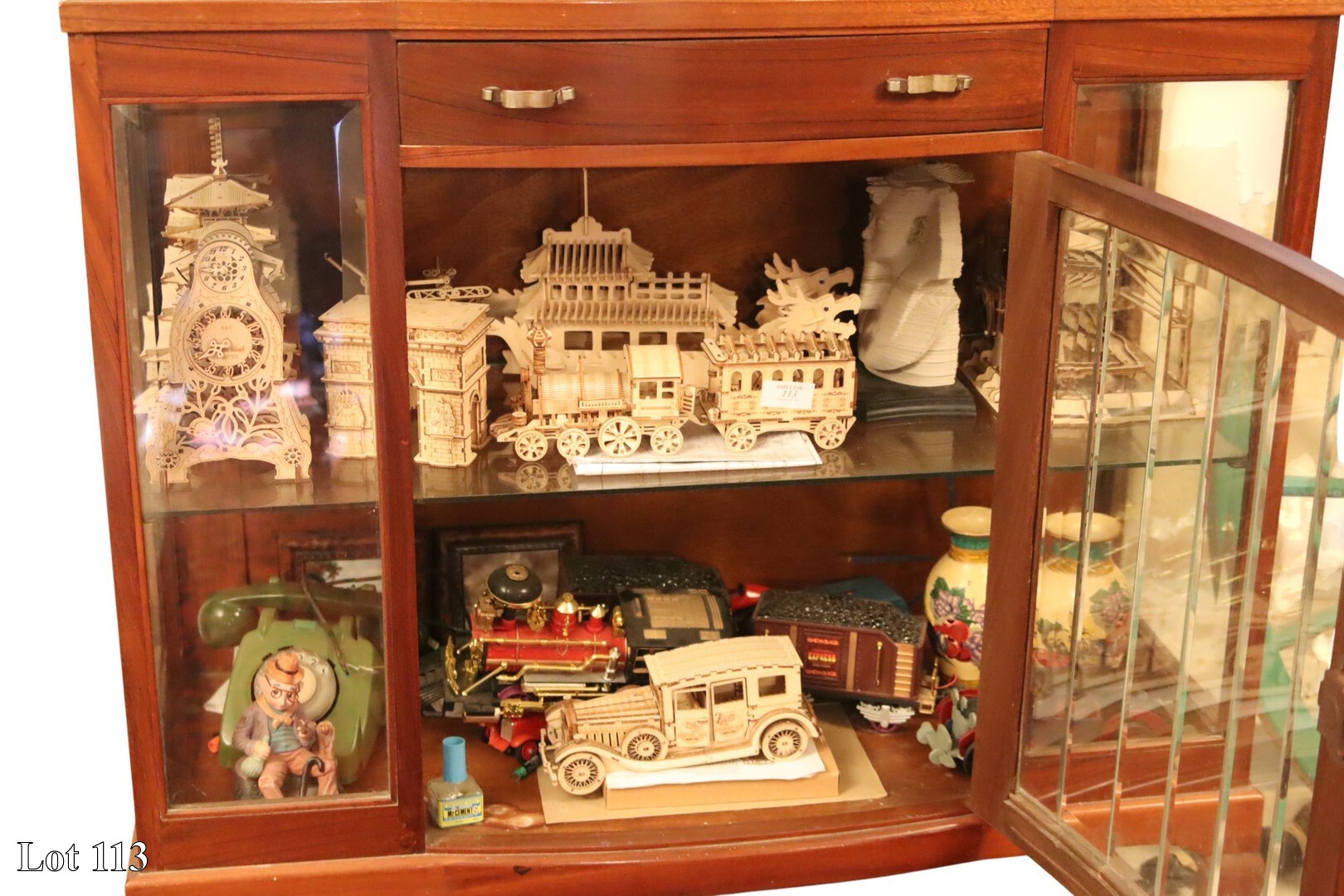 A collection of collectibles, with cabinet.
