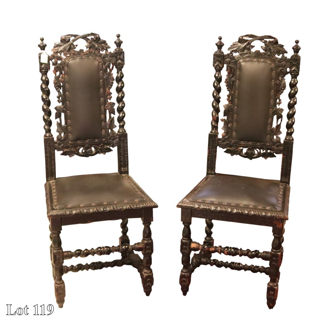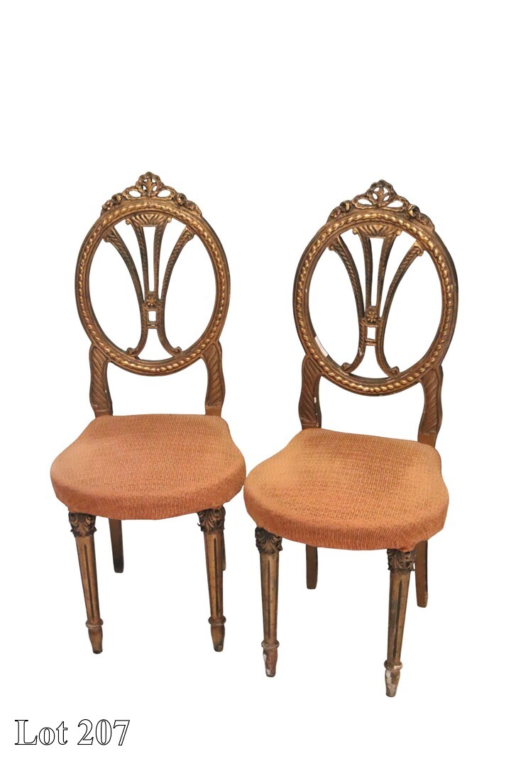 A pair of French style carved wood gilded upholstered chairs.