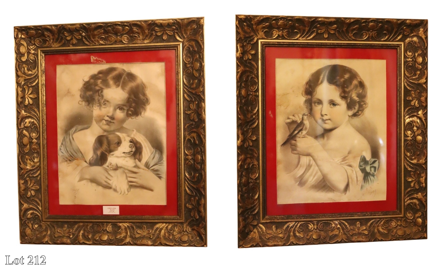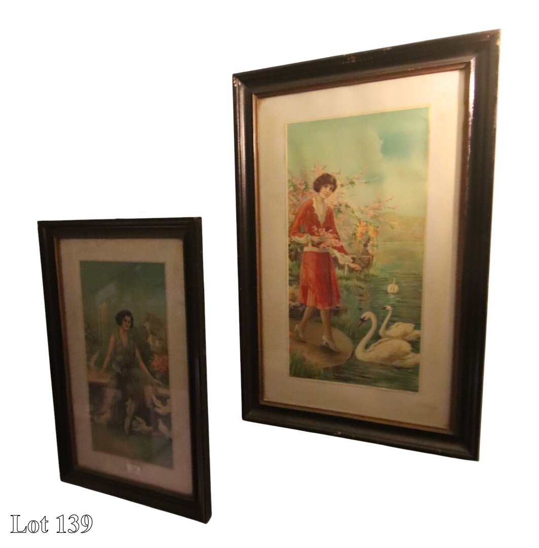 Late 19th Century, A Girl with her Dog, and a girl holding a bird, print. ( Width:56 Height:65 )