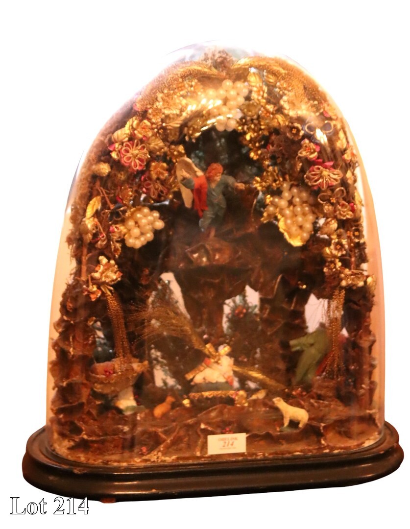 19th Century, small wax Baby Jesus under glass dome, on wooden plinth. ( Width:49 Height:57 )