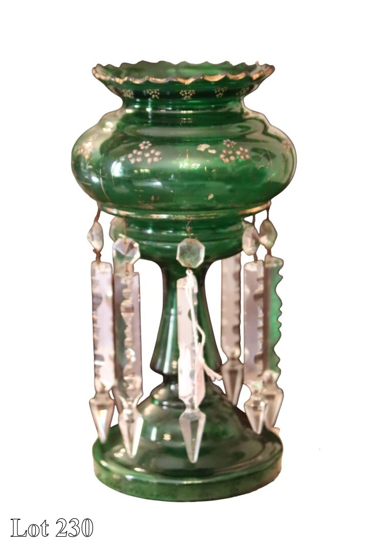 19th Century green glass girandole, with parcel gilt and prismatic drops.