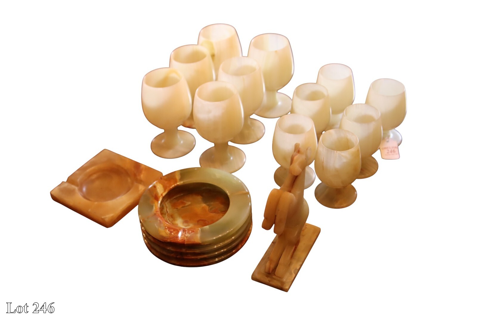 Two sets of six onyx goblets, horse and an ashtray.