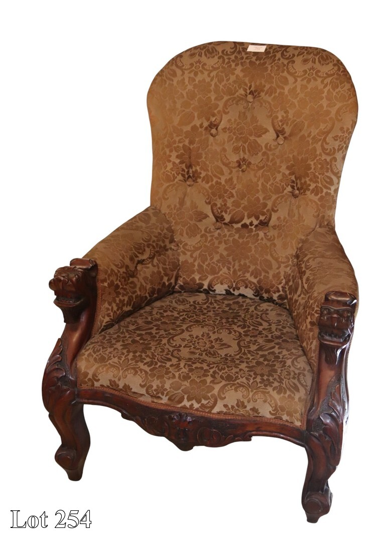 19th Century Maltese mahogany upholstered armchair, with grotesque masks, on cabriole legs.