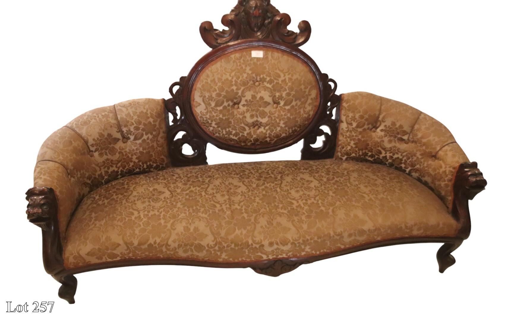 19th Century Maltese mahogany three seater sofa, with grotesque masks on cabriole legs.
